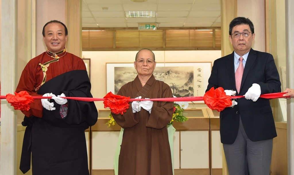 華梵大學9月24日上午舉行「青海熱貢唐卡藝術展」開幕式剪綵,(左至右)青海黃南州熱貢畫院娘本院長、華梵大學董事長悟觀法師、李天任校長。