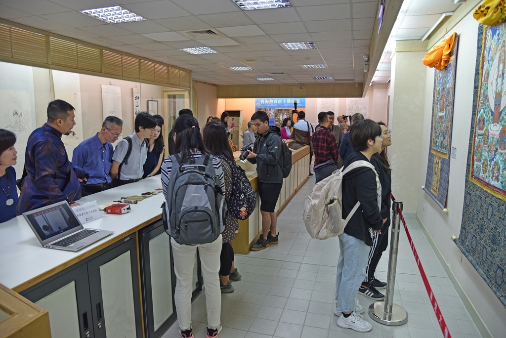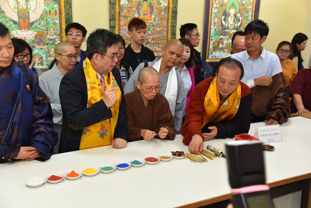 感佩華梵大學創辦人曉雲法師興辦教育的宏大願行,娘本院長昨日不遠千里來臺,將首次個展獻給華梵,下午並在國父紀念館舉行專題演講。慕國際唐卡大師之名而來的校內外參展、聽講人潮擠爆了開幕式與演講會場,對於娘本院長能用畫筆一絲一毫、線線分明的勾勒出僅2、3公分高的菩薩僧眾,連國際鑑定家用60倍放大鏡都找不出含糊之處的絕藝巧工,莫不大表讚嘆,驚艷不已。