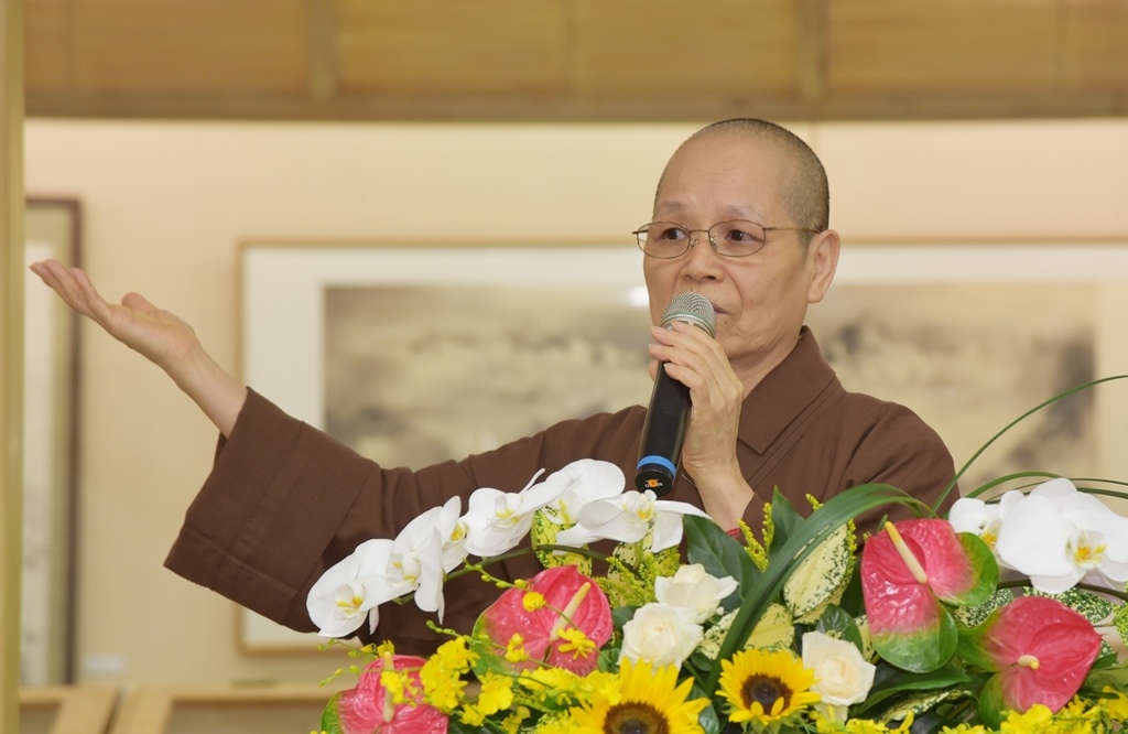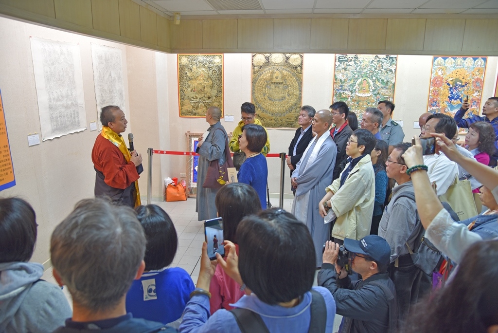 華梵大學董事長悟觀法師致詞表示,娘本院長繪製的唐卡有一股攝受人心的佛威神力,佛法的慈悲與智慧盡在其中,而娘本院長就宛如菩薩的代言人,是串連佛與眾生之間的橋梁,讓看見唐卡者都可開出自己生命智慧的般若畫。