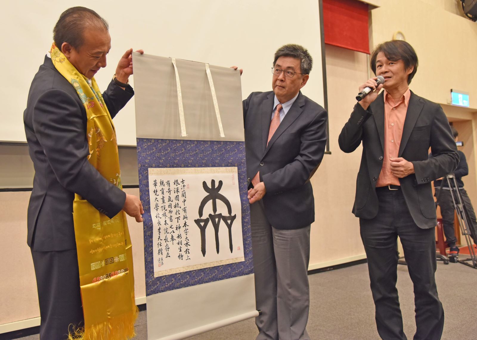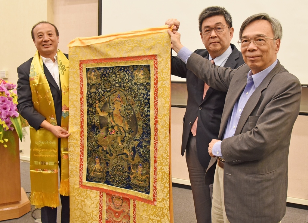 娘本院長(左一)捐贈市值約五百萬人民幣的「黑金唐卡」一幅給華梵大學典藏,由華梵大學李天任校長(中)、李復甸董事(右)代表接受。