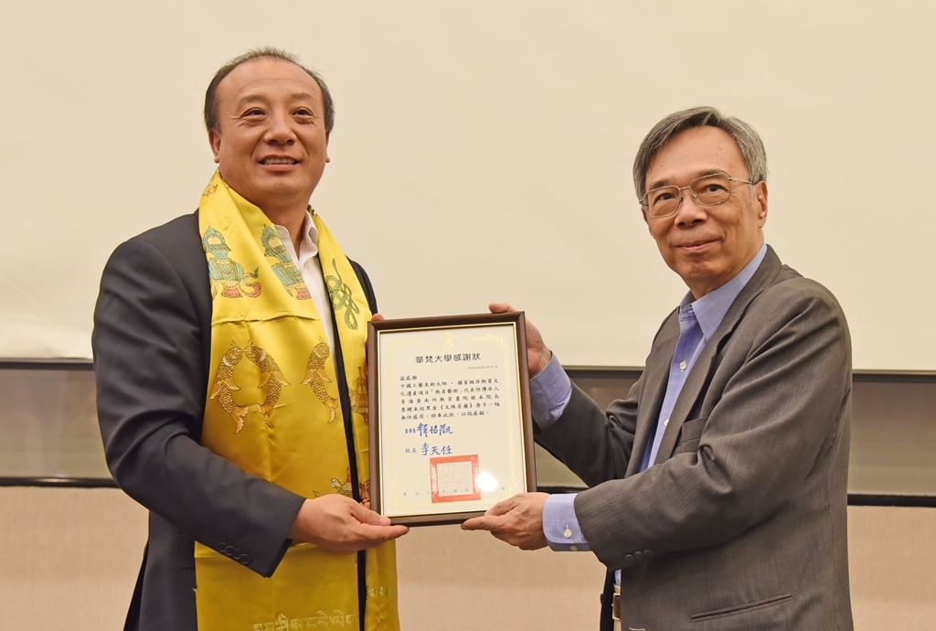 華梵大學9月24日舉行「青海熱貢唐卡藝術展」開幕式,展出中國工藝美術大師、青海黃南州熱貢畫院娘本院長一系列精品唐卡畫作,娘本院長並捐贈市值約五百萬人民幣的「黑金唐卡」一幅給華梵大學典藏,同時允諾將唐卡的繪製技藝無所保留的傳承給華梵學生,熱貢畫院也將成為華梵學生的青海學習基地。華梵大學李天任校長也頒發榮譽特聘講座教授證書給娘本院長。
