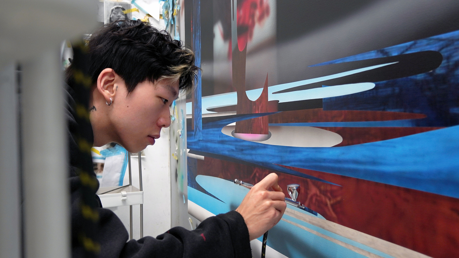 華梵大學美術系碩士生陳岳宏在學校提供的個人創作空間作畫。