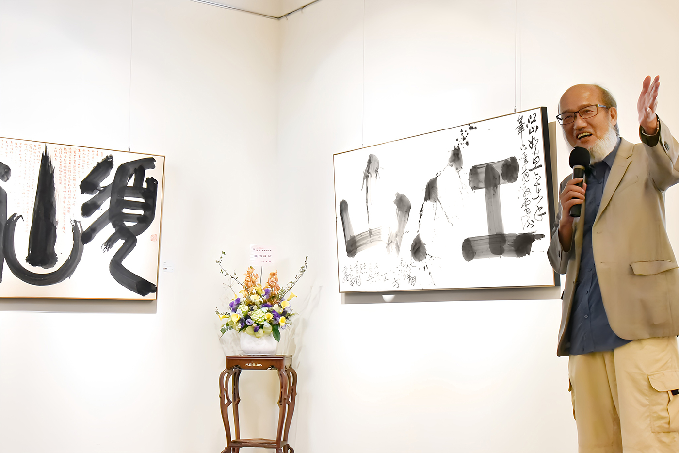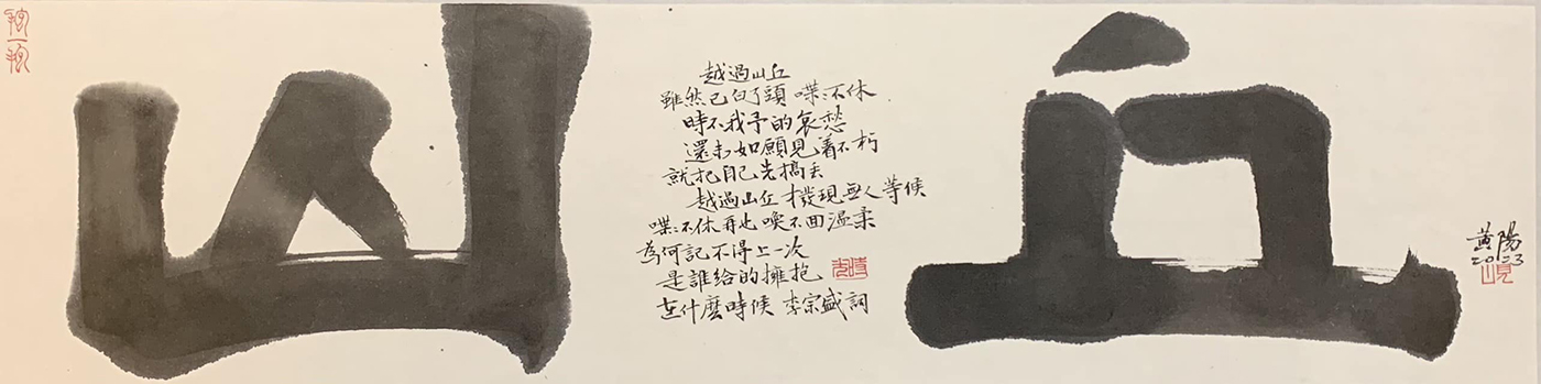 提及「山與山」創作展的因緣,黃智陽院長說,在華梵大學工作25年,深感來回山林與城市之間是一種特別的福分,每個人內心也都需要一座寧靜的山,才能在壓力中找到平衡點;而這次的創作內容與題材很平實,都是以現代人看得懂的語言書寫,希望呈現書法的當代生命力與轉型契機。