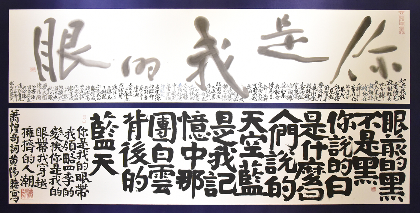 剛爬完郊山回來的華梵大學林從一校長也說,黃智陽書法的最大特色是將書法藝術從傳統橋接到當代進行化育,並特別注重與觀者互動溝通的過程;例如將「山」字翻轉不同角度創作出的「視力檢查表」,呈現了見山是山、見山不是山、見山還是山的意境,而正對面掛的即是流行歌手蕭煌奇的成名曲「你是我的眼」,如此巧思實在令人莞爾。