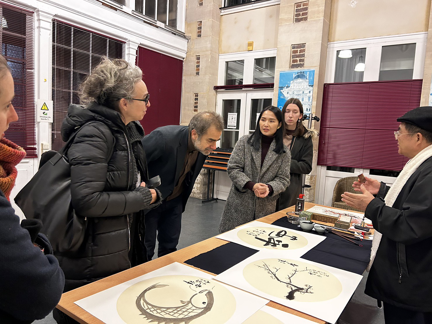 吳大仁老師(右)巴黎水墨展吸引許多法國人駐足欣賞,女兒吳軒慧(後排右二)也在場協助導覽與介紹作品。