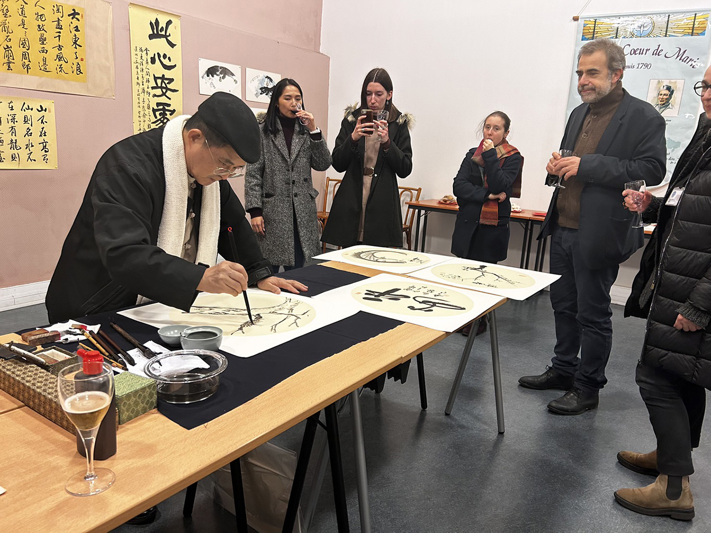 吳大仁老師並現場揮毫,邀請前來參觀的法國朋友分享充滿詩意的書法水墨之美,共同品味中華文化藝術饗宴,吳軒慧也在一旁熱情地協助導覽與翻譯,父女倆攜手在藝術之都為臺灣綻放光芒,成為藝壇佳話。