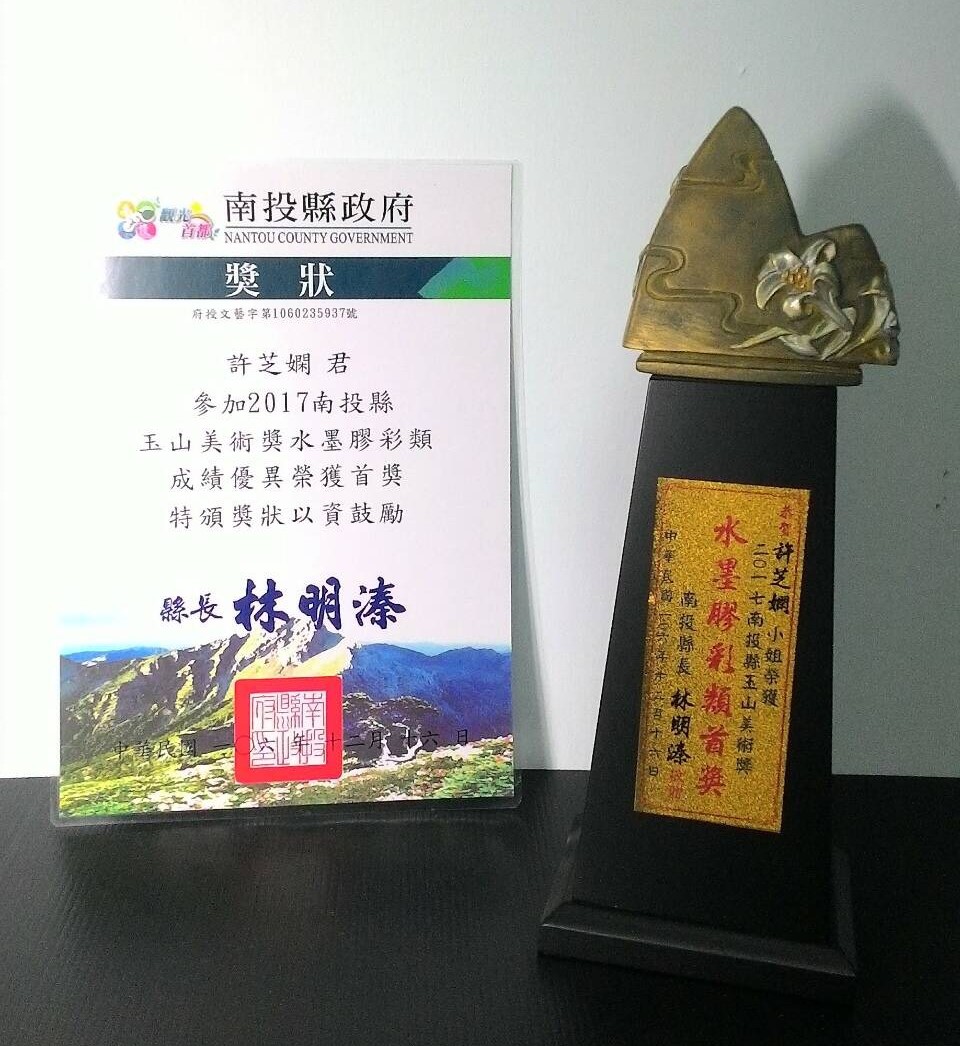 賀 美術與文創學系研究生許芝嫻同學參加「2017南投縣玉山美術獎」榮獲水墨膠彩類-首獎