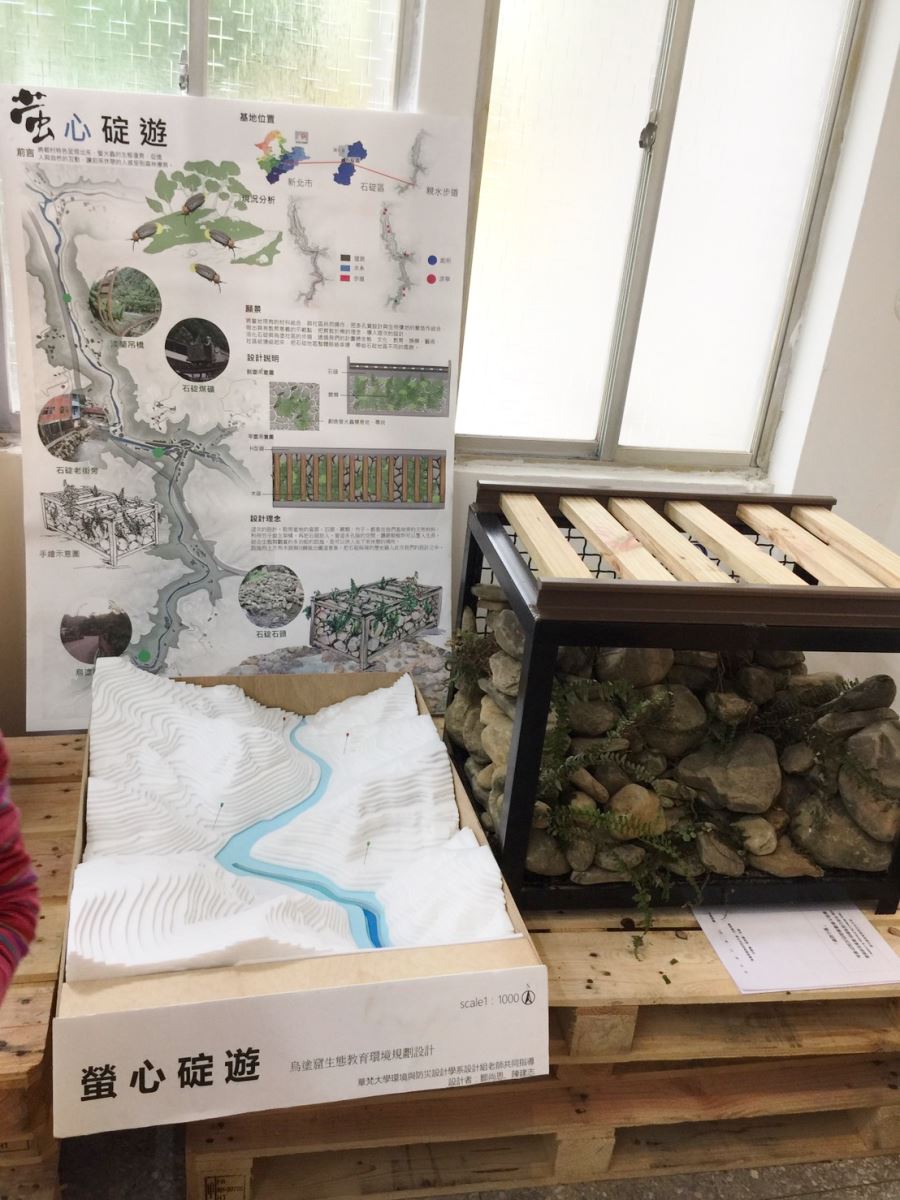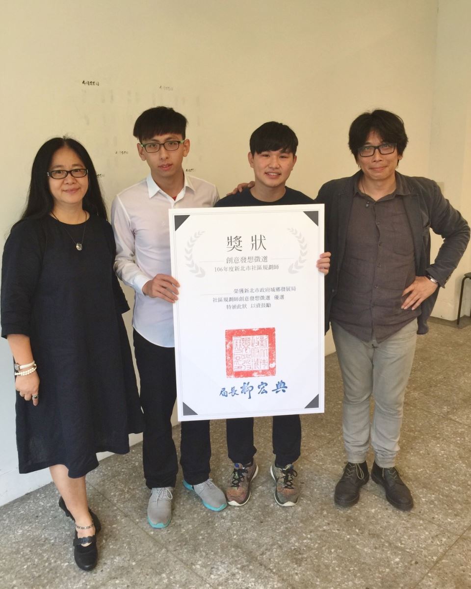 螢火蟲又被稱為環境指標生物,必須要在沒有農藥、光害,污染少的地方才能生存,只要一盞鄉間小道上的路燈,都會讓螢火蟲無處可藏,可見得復育螢火蟲是多麼困難,看同學如何突破盲點,想了什麼好方法。 環境與防災設計學系黃小玲老師(左一)指導大三設計組鄒尚恩(右二)、陳建志(左二)同學參加「106年度新北市社規師創意發想徵選」,榮獲優選。 獲獎作品-「螢心碇遊」。
