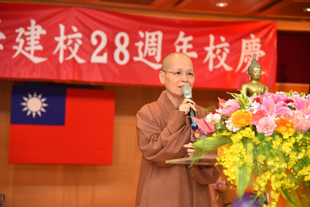 董事長悟觀法師於典禮致詞中,特別闡述創辦人曉雲導師創辦華梵大學的理念與精神,勉勵所有的華梵教職同仁。董事長悟觀法師說:華梵是我們創辦人 曉雲導師一部鮮活而未完成的藝術創作,也是他老人家最後的一幅為教育精進的華梵園地,未完成的部份,老人家他留待有緣人一起繼續努力推動,我們要跟創辦人一樣,做一頭教育的耕牛。華梵人二十八年互助互敬,是森林的華梵,覺苑的華梵,藝術的華梵,如是顯人性本體之內在美。創辦人説:「生命流轉是現象,不生不滅是本體」;誠如江河流水變動是現象,而江河的水流不斷是本體。人亦如是,華梵教育亦復如是,要顧住本體,如川流生生不息的辦學,不畏懼當前的情勢變動現象所擾亂,我們要本著教育的良心,善用創辦人所打造出來的基礎理念宗旨,來克服如江河流水所變動出的現象。我們要堅持堅信敬信,創辦人 曉雲導師貞定「覺之教育」為創校理念,乃生命可貴,貴在人生「能仁」發揮「德性」;所以華梵的校訓「德智能仁」,要華梵人「鮮活」的體解善用「人文與科技融匯;慈悲與智慧相生」刻刻不離宗旨,步步當有歸程,歸向教育的旨趣。我們要時時思考,華梵這一幅活妙的藝術創作的靈活,來自於生命的宗旨歸程,需要有緣人一同來完成。