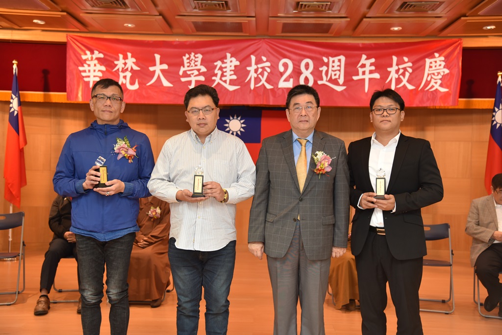 李天任校長(右二)頒發華梵傑出校友獎:(左至右)中國文學系趙銘豐校友、工業工程與資訊經營學系游雲吉校友、美術與文創學系華安綺校友、景觀與環境設計學系林煥軒校友。