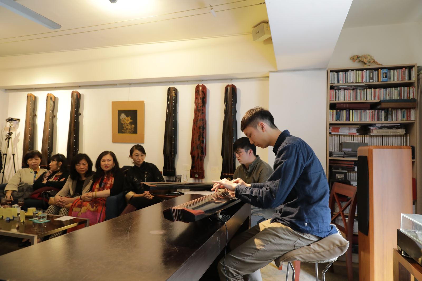 華梵大學哲學系四年級王沛恩同學(右)於古琴製作成果師生聯展展演。