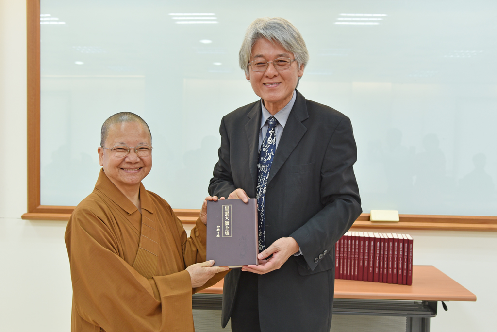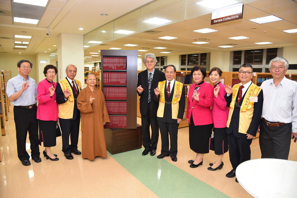 國際佛光會中華總會北區協會區委員林財盛先生及其夫人國際佛光會中華總會新莊第三分會會長劉鐘蓮女士,在佛光山新莊擇善寺住持永堂法師及多位師兄姊陪同下,於107年4月27日蒞臨華梵大學,捐贈共365冊的《星雲大師全集》一套及旋轉4面書架一座,由高柏園校長代為接受。目前該套書放置於圖書館一樓的參考室,歡迎大家踴躍前往參閱。