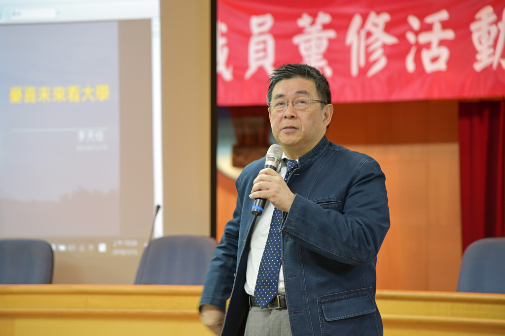 之後,華梵董事會監察人、文化大學校長、私校協進會理事長李天任校長主講「憂喜未來看大學」,陳述華岡與華梵相向而視之獨特緣份;講述台灣高教現況與挑戰,標舉新型態的高教思維,並提出對於未來之思考,與華梵同仁分享、共勉。