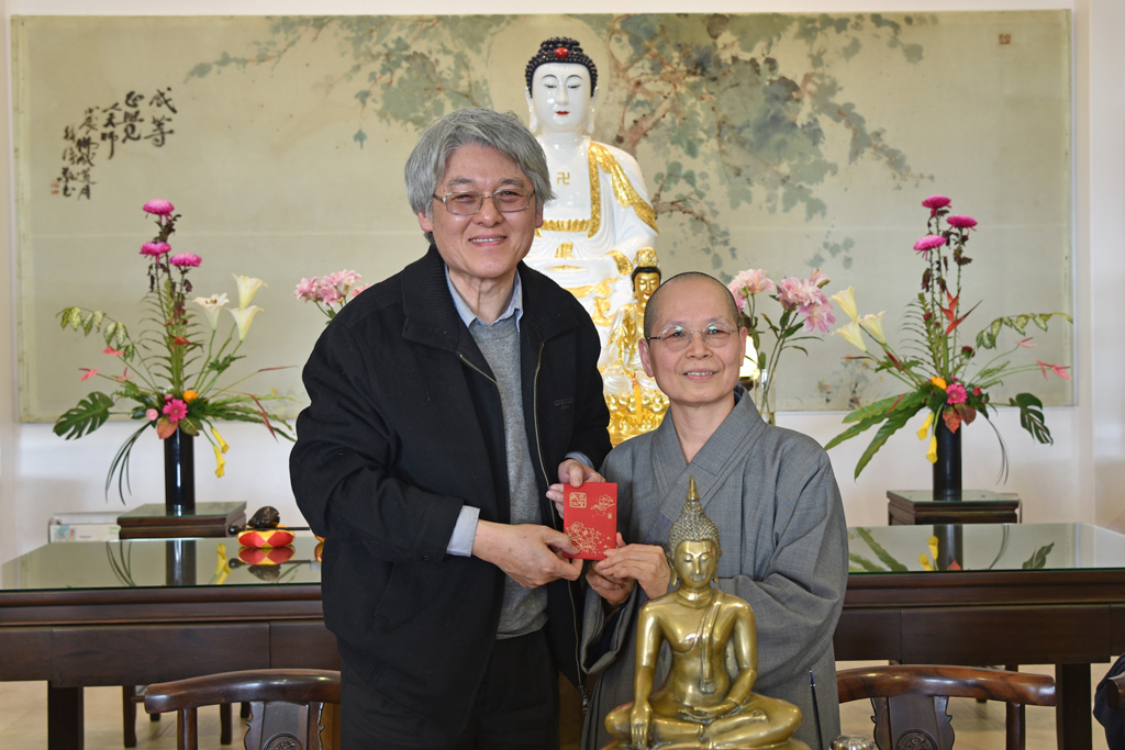 董事長悟觀法師發送所有教職員同仁新年祝福紅包,感謝同仁努力,左為高柏園校長。