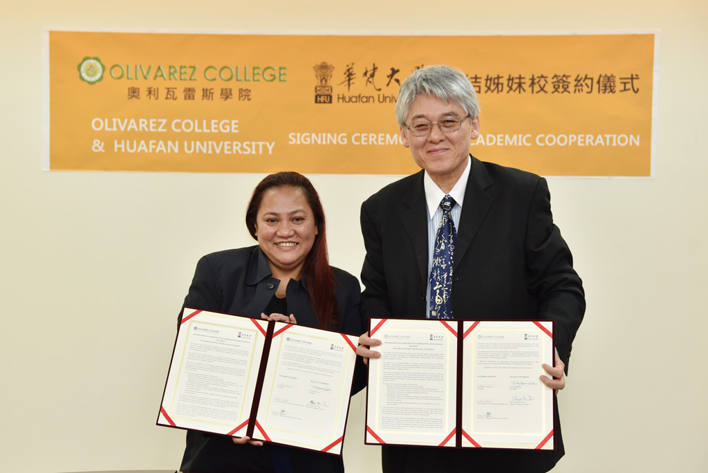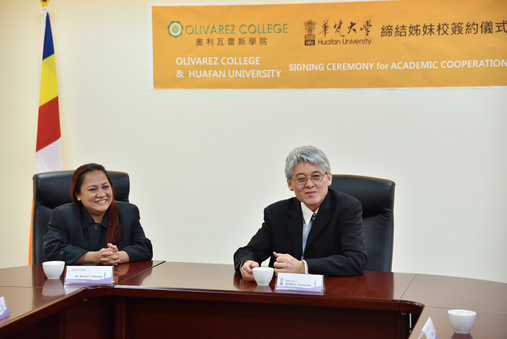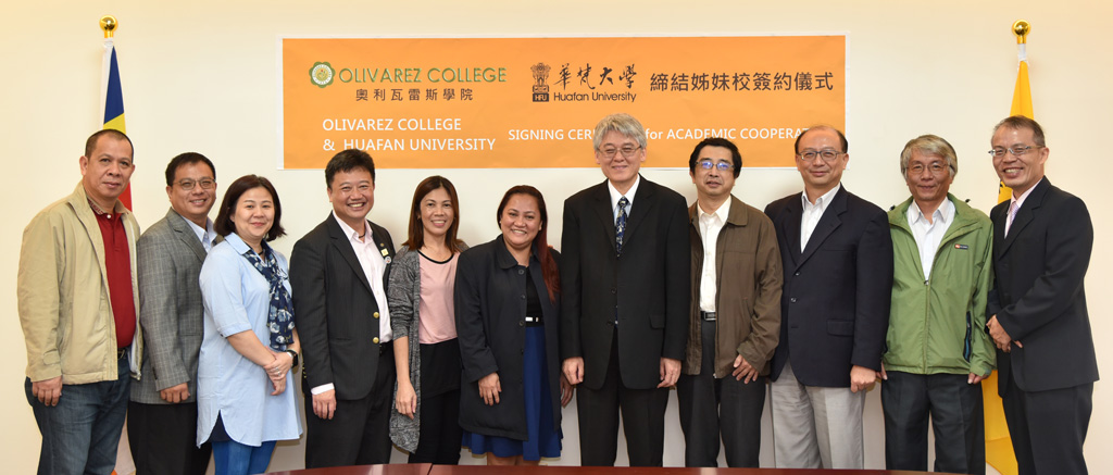 「新南向」的第一步,華梵與菲律賓奧利瓦雷斯學院Olivarez College締結姊妹校!奧利瓦雷斯學院交流團一行7人於106年11月14日蒞校參訪交流座談及簽約,由高柏園校長代表簽約,包括蔡傳暉教務長、張壯熙總務長、張鴻彬圖資長等人觀禮,該校國際事務長Marilyn P. Allanigue女士將合約帶回轉交該校校長簽名,未來兩校將先從教師互訪及交換開始交流,之後更將進行學生交換。