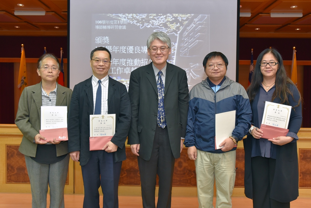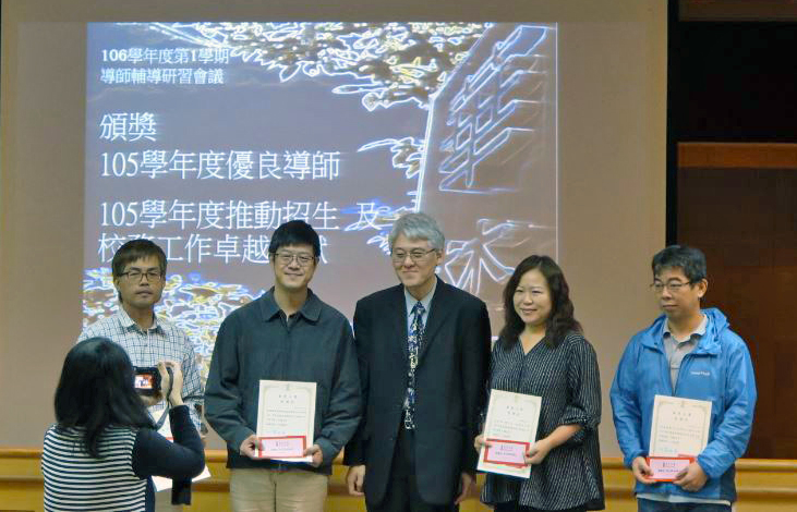 會中頒發校105學年度校優良導師獎,得獎名單:機電工程學系趙慧青老師、工業設計學系黃士嚴老師、中國文學系王隆升老師、環境與防災設計學系 黃小玲老師。