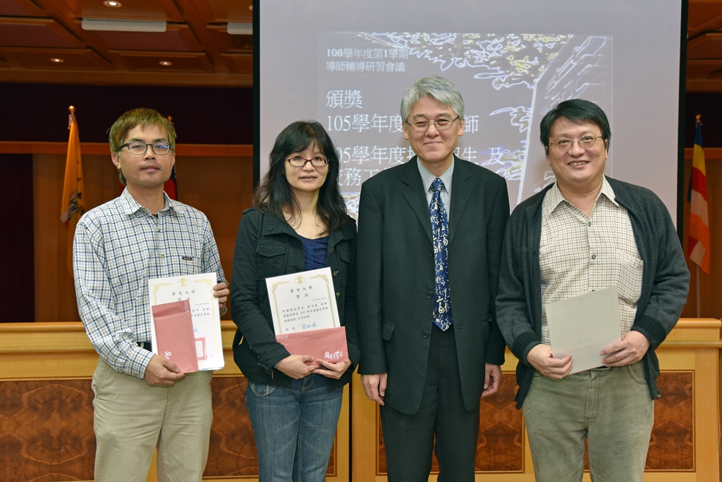 頒發105學年度系所優良導師獎,得獎名單:外國語文學系黃玉枝老師、哲學系伍至學老師、佛教學系林煌洲老師 、工業工程與經營資訊學系嚴建和老師、電子工程學系王盈中老師。