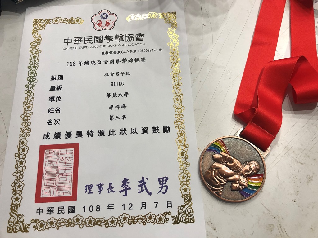 華梵大學工業設計學系交通工具設計組二年級學生李得峰參加中華民國108年總統盃拳擊錦標賽,以堅強的實力奪下社會組91公斤以上級第三名的佳績,消息傳回校內,師生都同感振奮且與有榮焉。