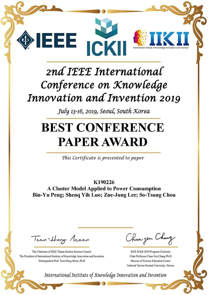 華梵大學機電工程學系博士班四年級學生彭賓鈺以論文「一種應用於電力消費的聚類模型」(A Cluster Model Applied to Power Consumption),參加第二屆「 IEEE國際知識創新與發明會議 2019 年國際研討會」(IEEE ICKII 2019),榮獲該國際會議最佳會議論文獎!