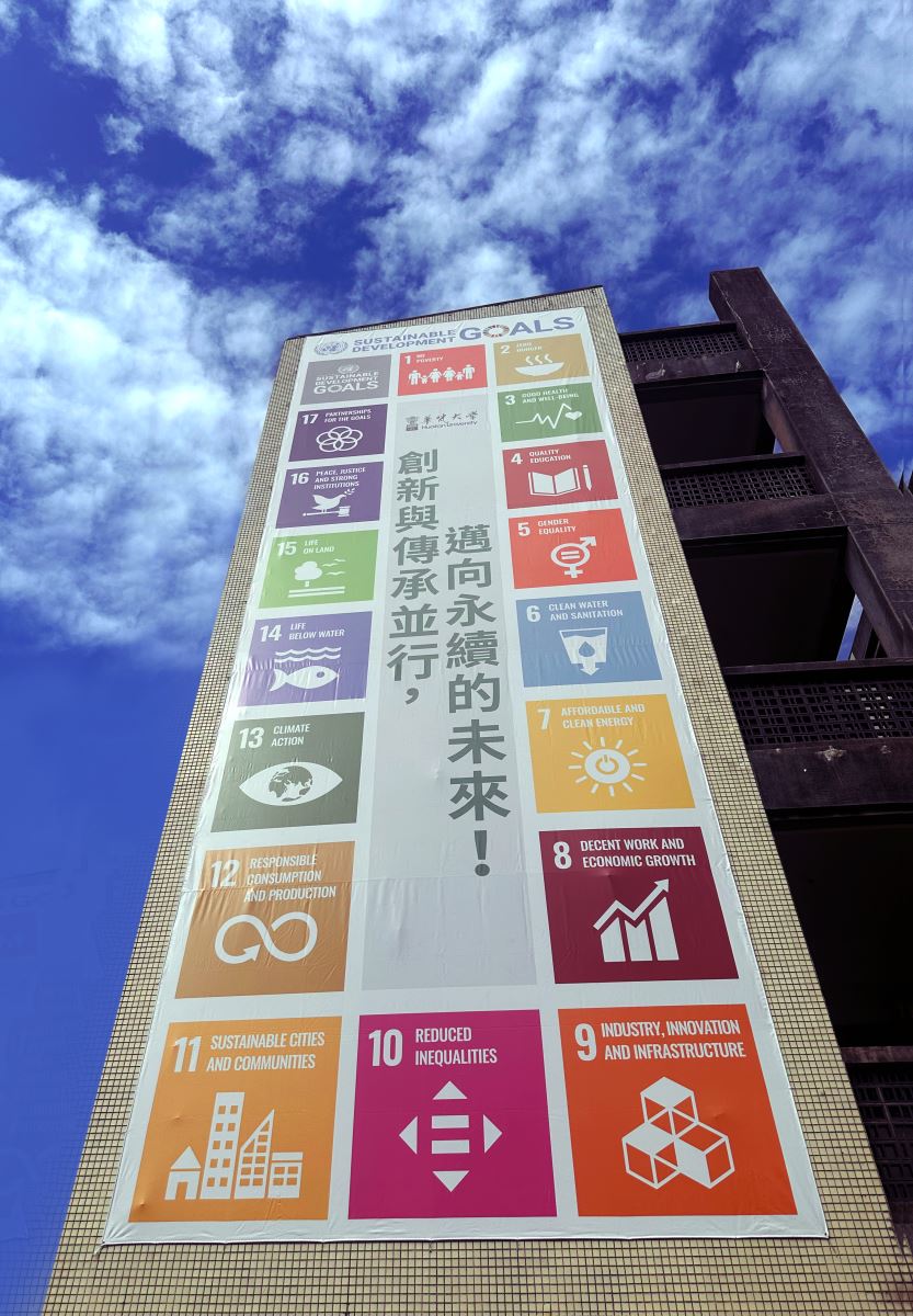 華梵大學為積極實踐聯合國17項永續發展目標(SDGs)設計巨幅海報。