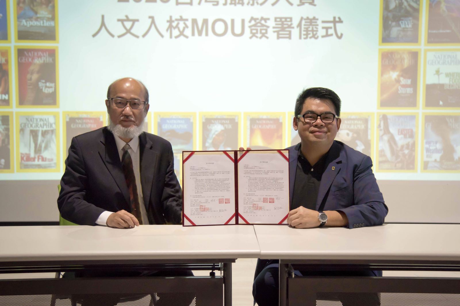 華梵大學林從一校長(左)與國家地理雜誌業務副總劉念祖簽訂合作備忘錄。