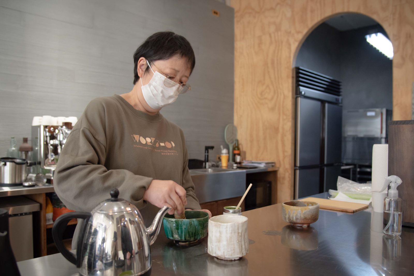 日本札幌市立大學張浦華教授於「2023臺日國際陶藝柴燒工作營成果展」現場,為來賓準備日式抹茶。