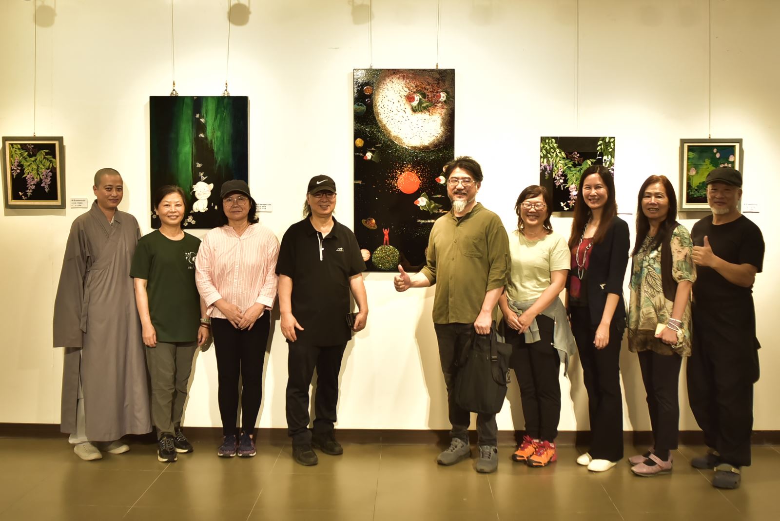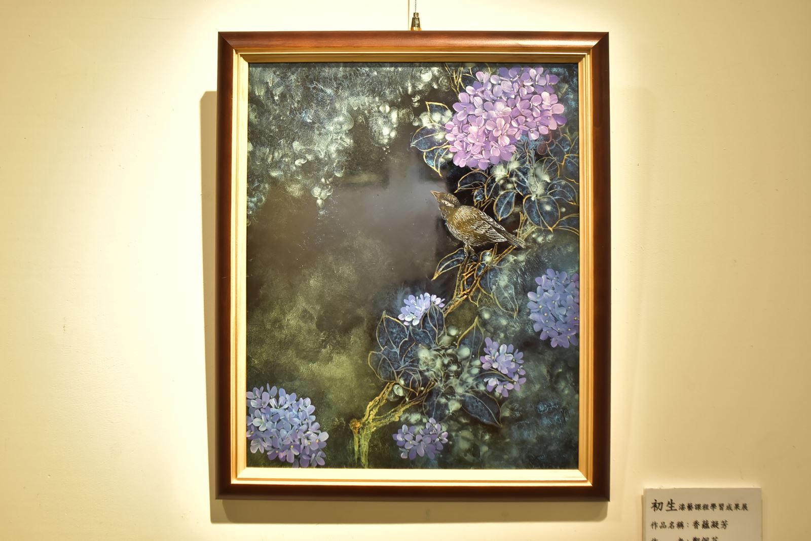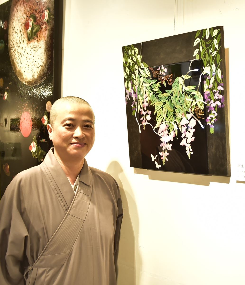 值得一提的是,出家前學習室內設計的佛藝系一年級學僧淨意法師,將王清源老師教大家臨摹的作品〈紫藤〉,運用巧思加上燈飾,呈現出夜空閃爍的感覺,將紫藤花妝點得更繽紛雅致,相當獨樹一格。