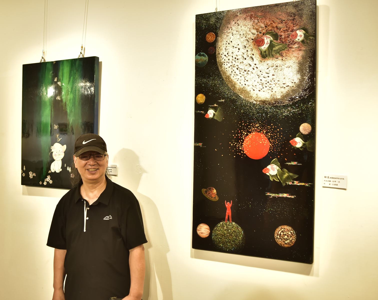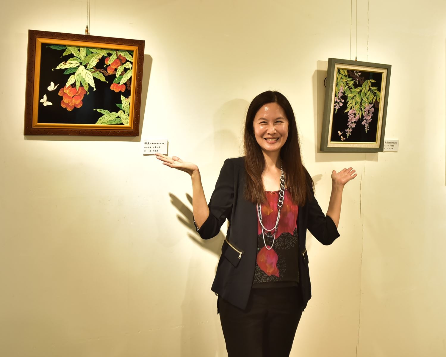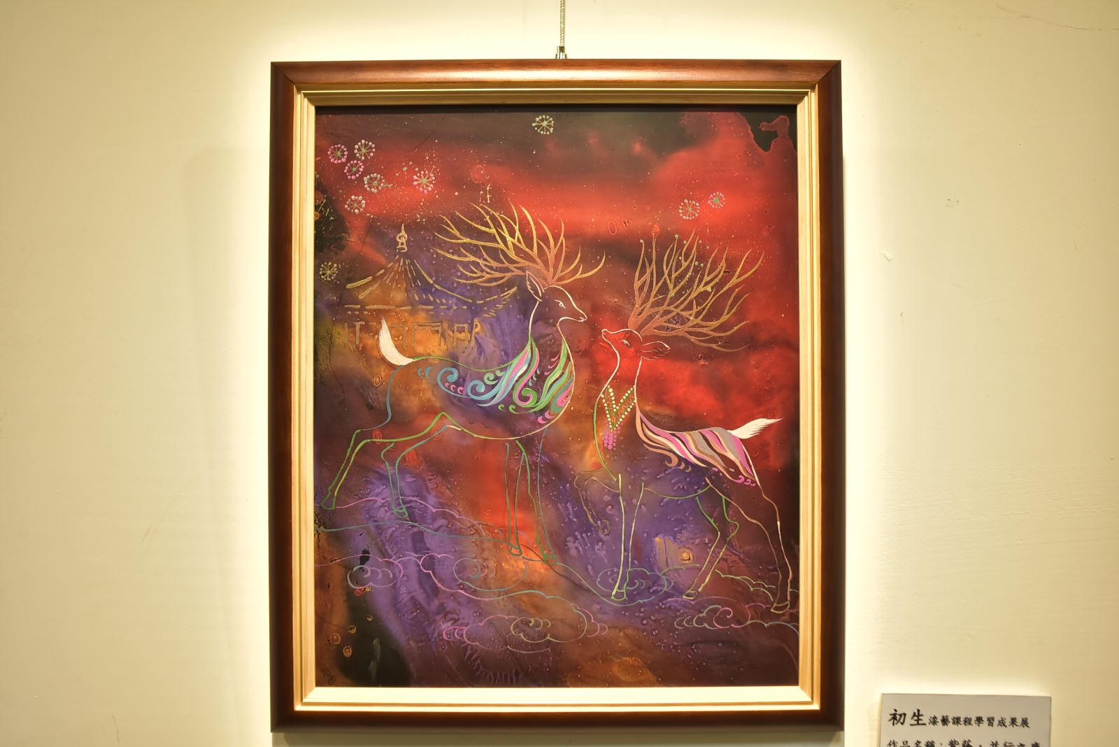 現場也有許多同學的優秀創作,例如美術與文創學系母女檔——碩士班二年級林楷媛的作品〈紫蔭•並行之鹿〉、〈敦煌之願•白鹿〉,將佛教故事中的九色鹿畫得靈動輕巧,充滿夢幻仙氣;以及就讀碩士在職專班三年級的母親張芸青作品〈三龍•幻漆〉、〈焚夜龍息〉,展現虛空中騰龍駕霧的不凡靈氣,都極具原創性並引人入勝。