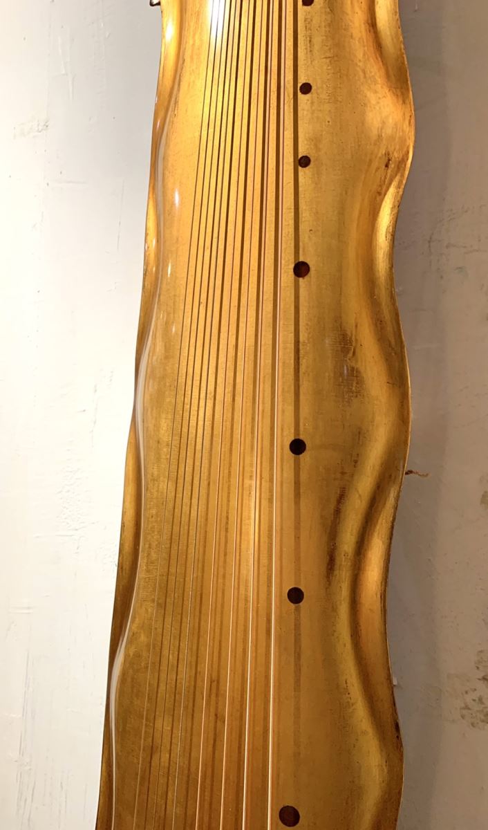 林正雄教授指出,柯宗苗深知今生的志業就是供養佛道,因此兩年前報名參加斲琴工坊時,就在神明面前發願,希望能以神像安金箔的方式,親手斲製一張極其稀有罕見的「金箔古琴」獻給神明。