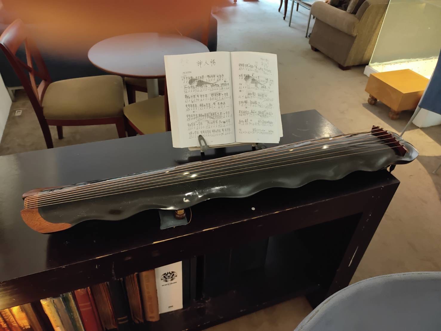華梵大學斲琴工坊成果展現場展示的古琴與琴譜。