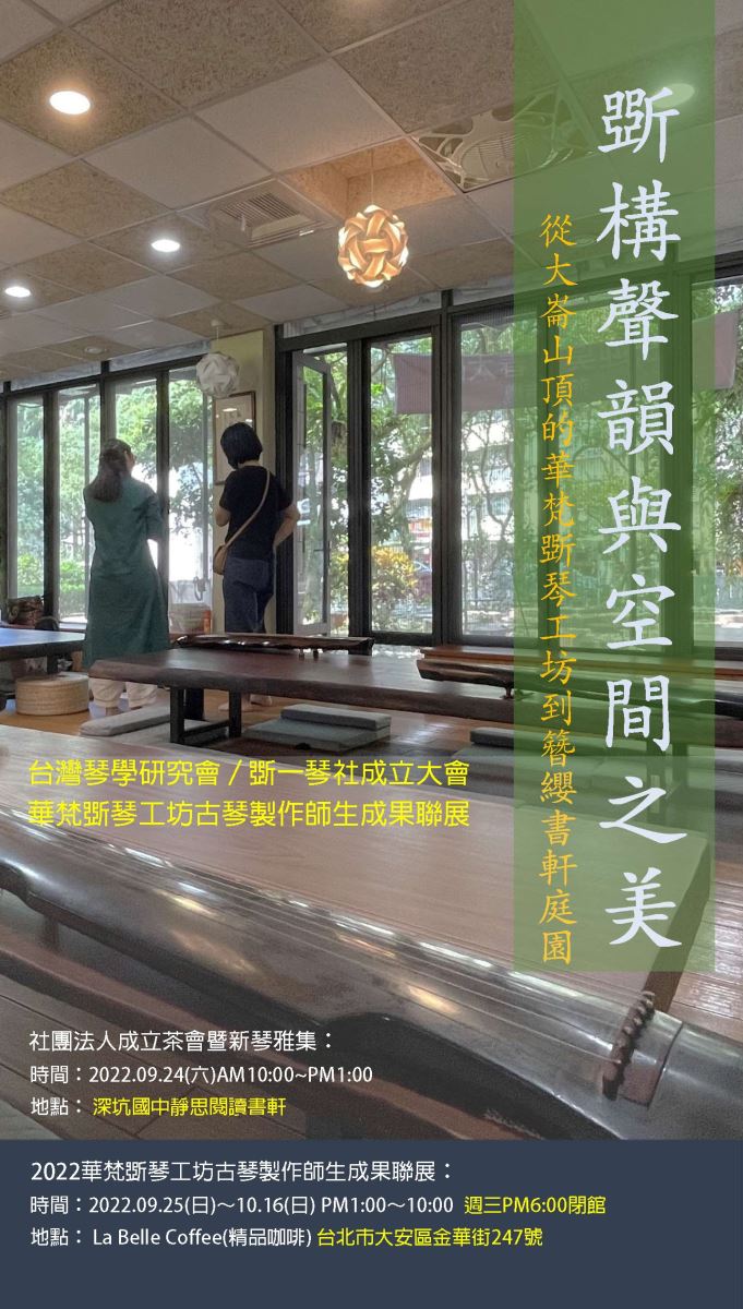 今年華梵斲琴工坊成果展演主題為「斲構聲韻與空間之美」,活動內容特別豐富,首先於9月24日在新北市文山地區深坑國中靜思閱讀書軒舉辦「新琴雅集」與「華梵斲琴工坊古琴製作成果師生聯展」,邀請學員展示自己費時一年精心製作的古琴,並輪番上台彈奏,與現場來賓共賞悠揚琴音與斲琴工藝,正式宣告古琴藝術從華梵校園走向社區,進行社區創生與空間美學營造。
