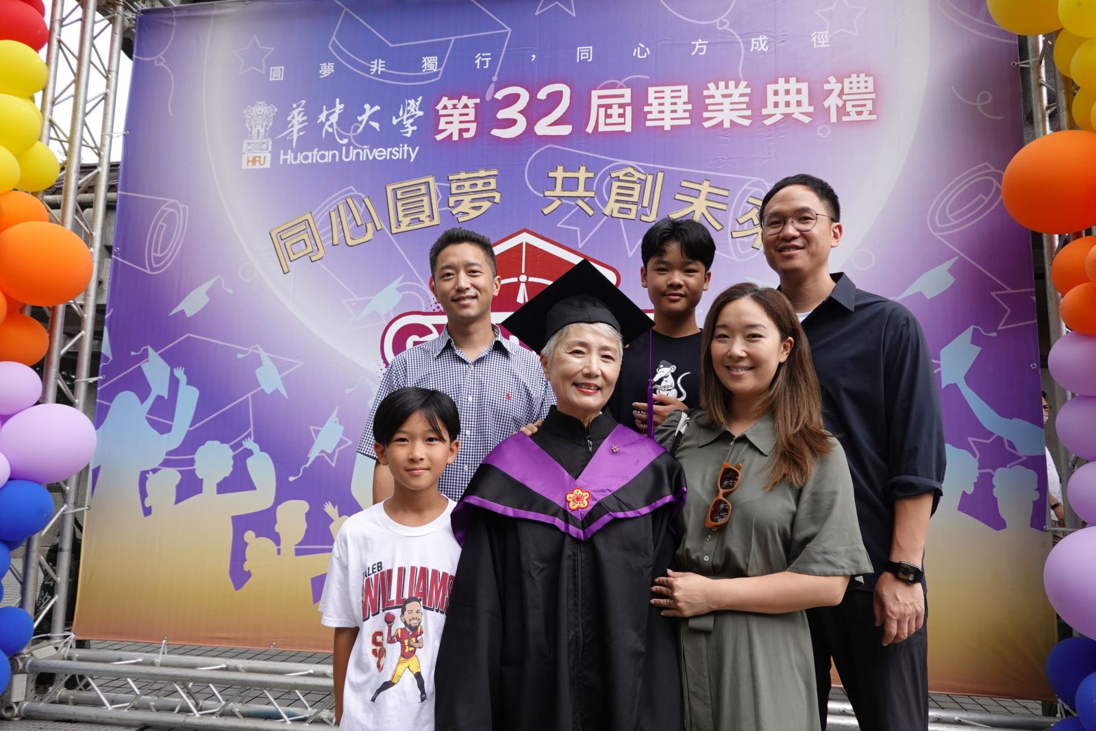 另一位邁入花甲之年的佛教藝術學系碩士葉秀青也是全家出動,從一雙兒女、女婿到兩個外孫都來參加媽媽與外婆的畢典。將升八年級的外孫鄭自詒說,很開心外婆都會得意的把自己的畫畫作業秀給他們看。