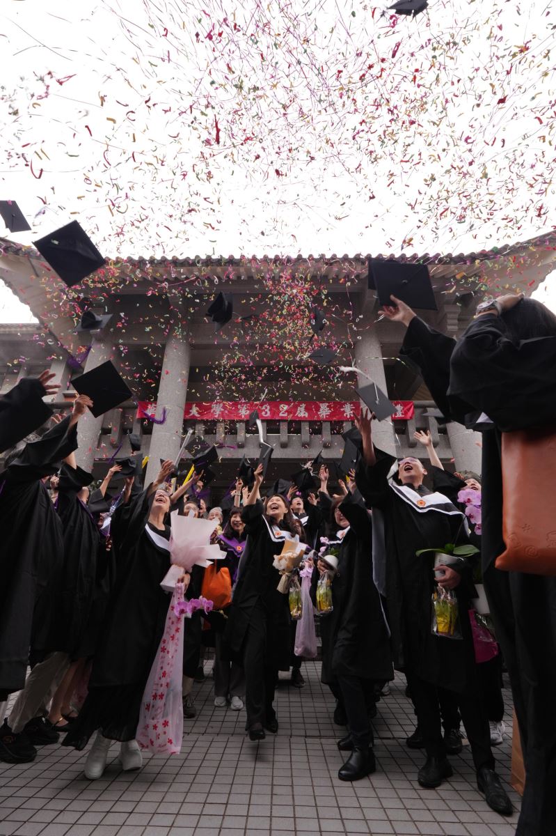 華梵大學舉行113學年度畢業典禮,年輕學生與熟齡學生一起拋帽慶祝畢業快樂。