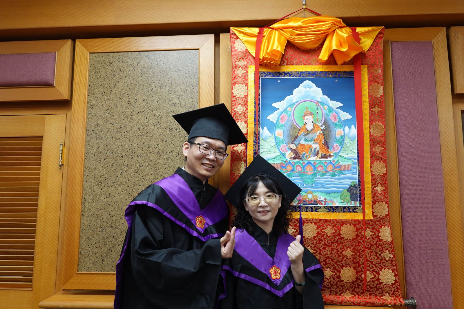 鄭絜襄笑著說,別的同學都是媽媽參加女兒的畢典,而她能參加媽媽的畢典,感覺特別有趣,所以二話不說就過來了。鍾麗霞的律師先生鄭華合也說,太太進華梵佛藝系後心念變得更寬,不再侷限自己的小框框裡,而他也耳濡目染,利用假日到華梵學分班學習篆刻,夫妻倆有共同的興趣與話題,生活更有意義。