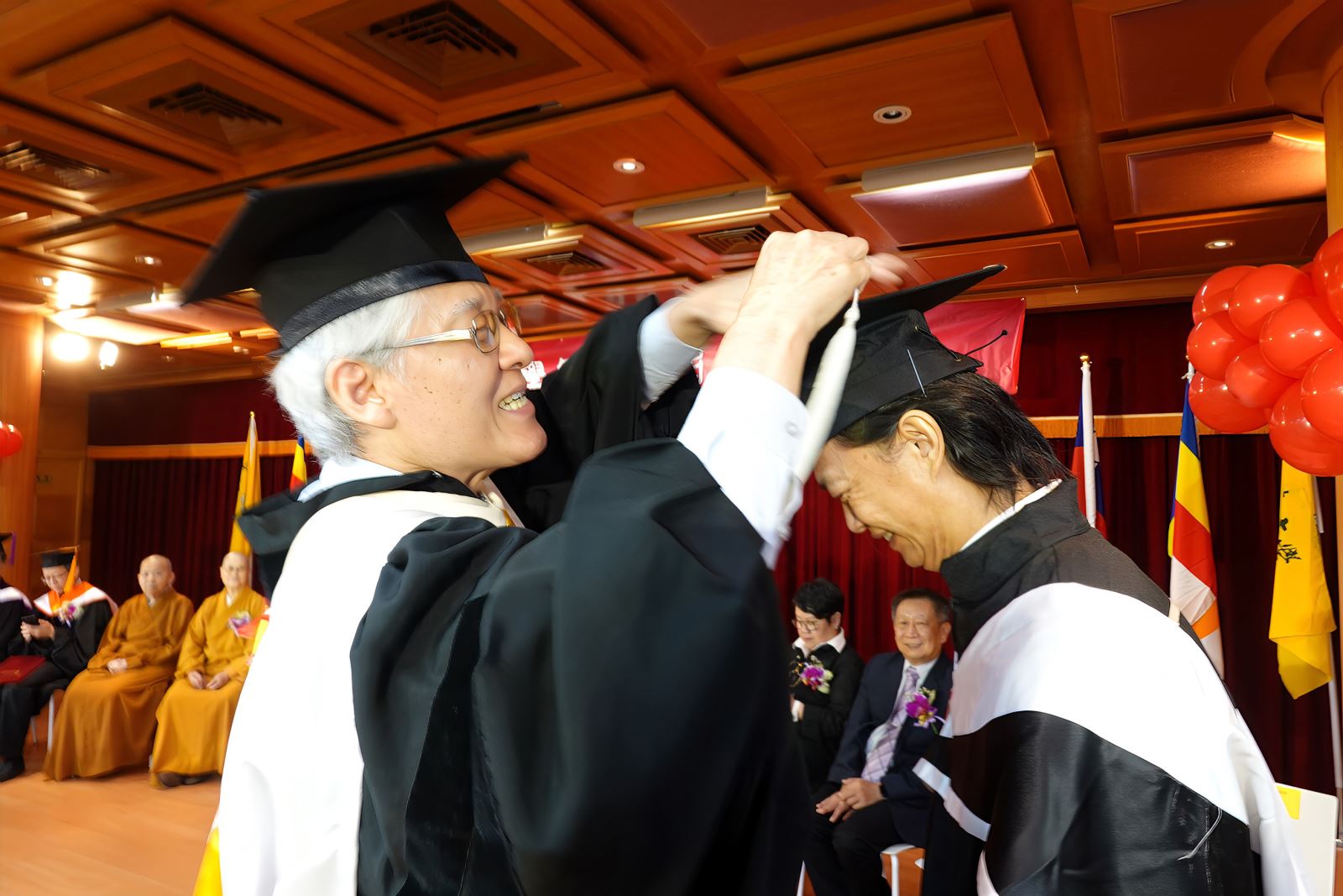 華梵大學東方人文思想研究所所長高柏園(左)為畢業同學正冠撥穗。