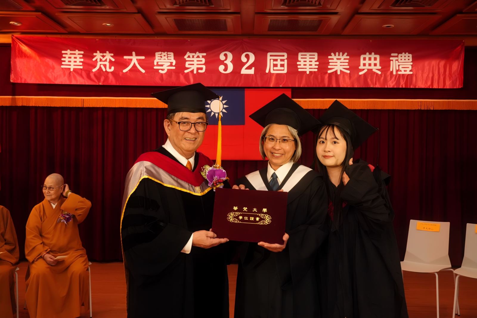 華梵佛藝系畢業生鍾麗霞(中)上台接受李天任校長(左)頒發畢業證書,同一天在文大畢業的女兒鄭絜襄也趕來參加。
