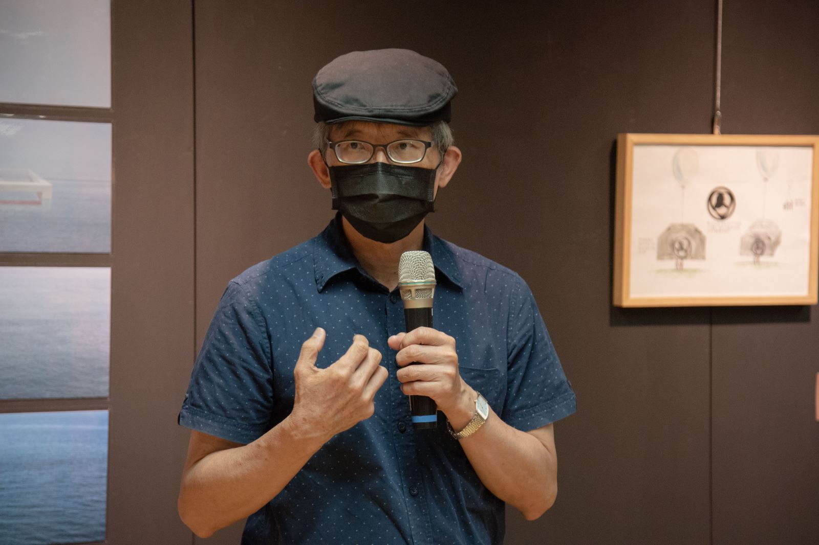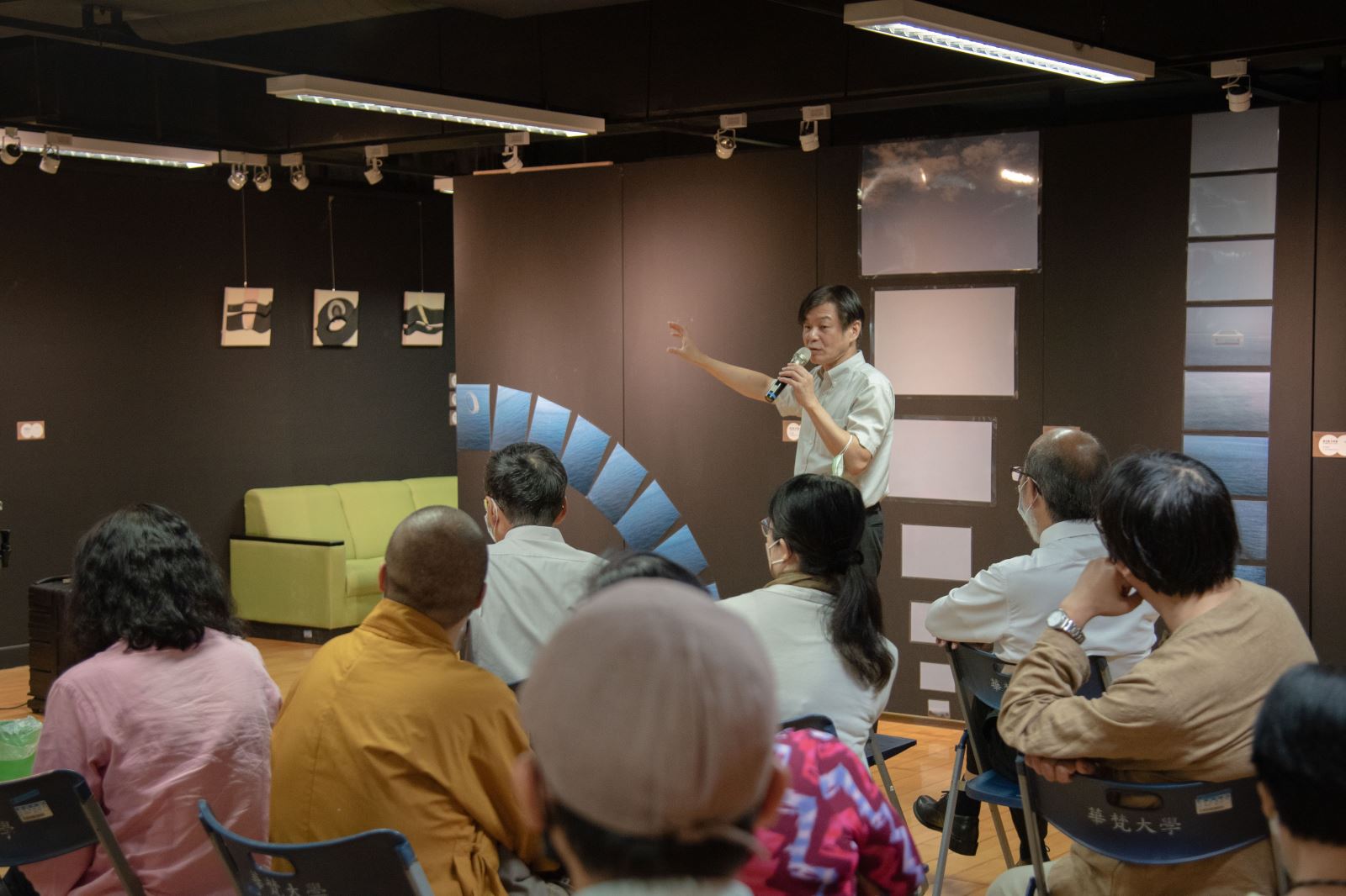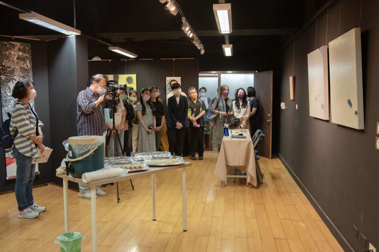 2022華梵大學美術與文創學系教授聯展開幕茶會,來賓聆聽導覽。