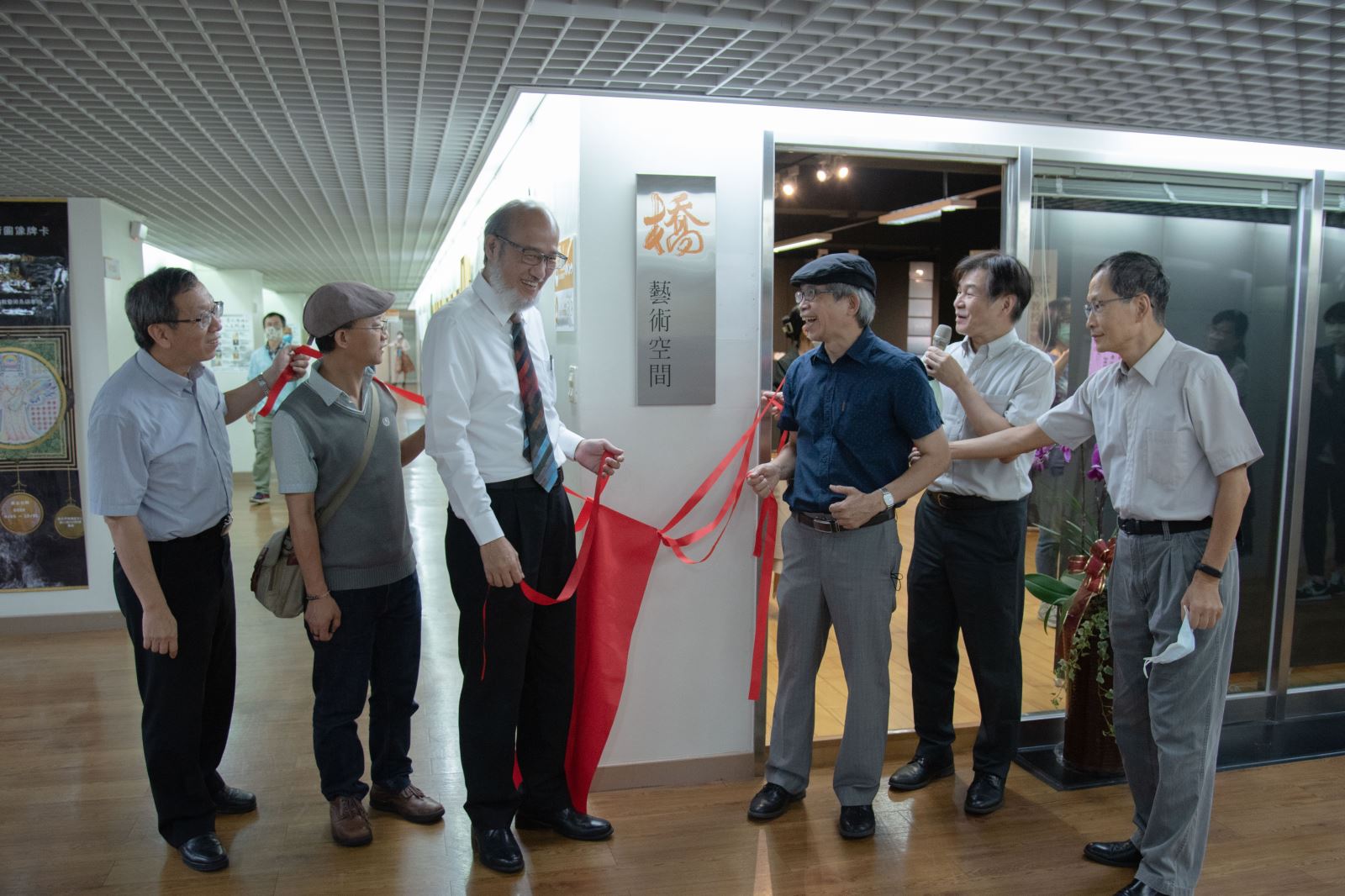 華梵大學新北板橋中心「橋藝術空間」揭牌過程,歡樂十足,左起:簡江儒教務長、連建興教授、林從一校長、廖新田教授、黃智陽院長、盧人仰教授。