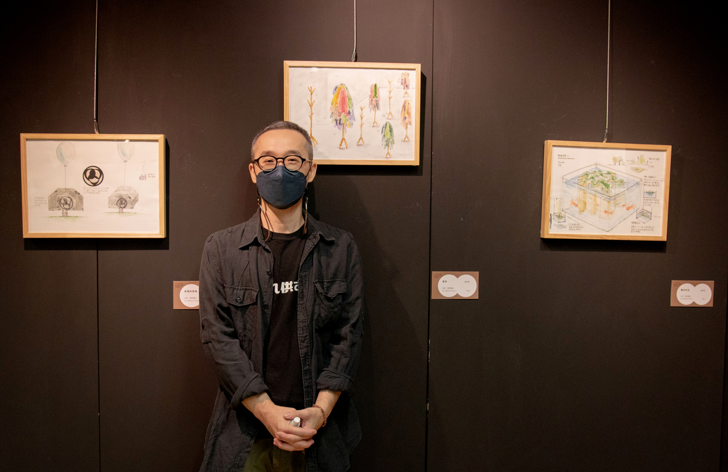 華梵大學美術與文創學系楊侖老師與作品(由左至右)《蜇伏》、《超以象外得其環中》、《穿梭》。