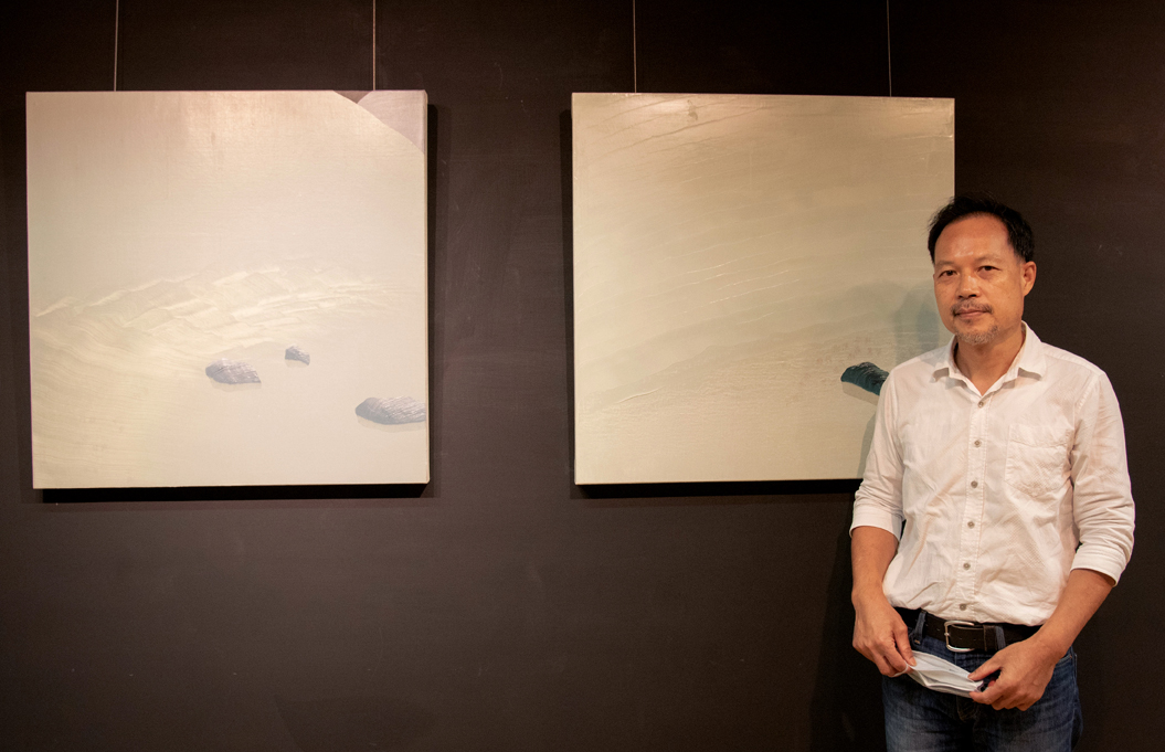 華梵大學美術與文創學系林萬士老師與作品(由左至右)《靜觀》、《靜默》。
