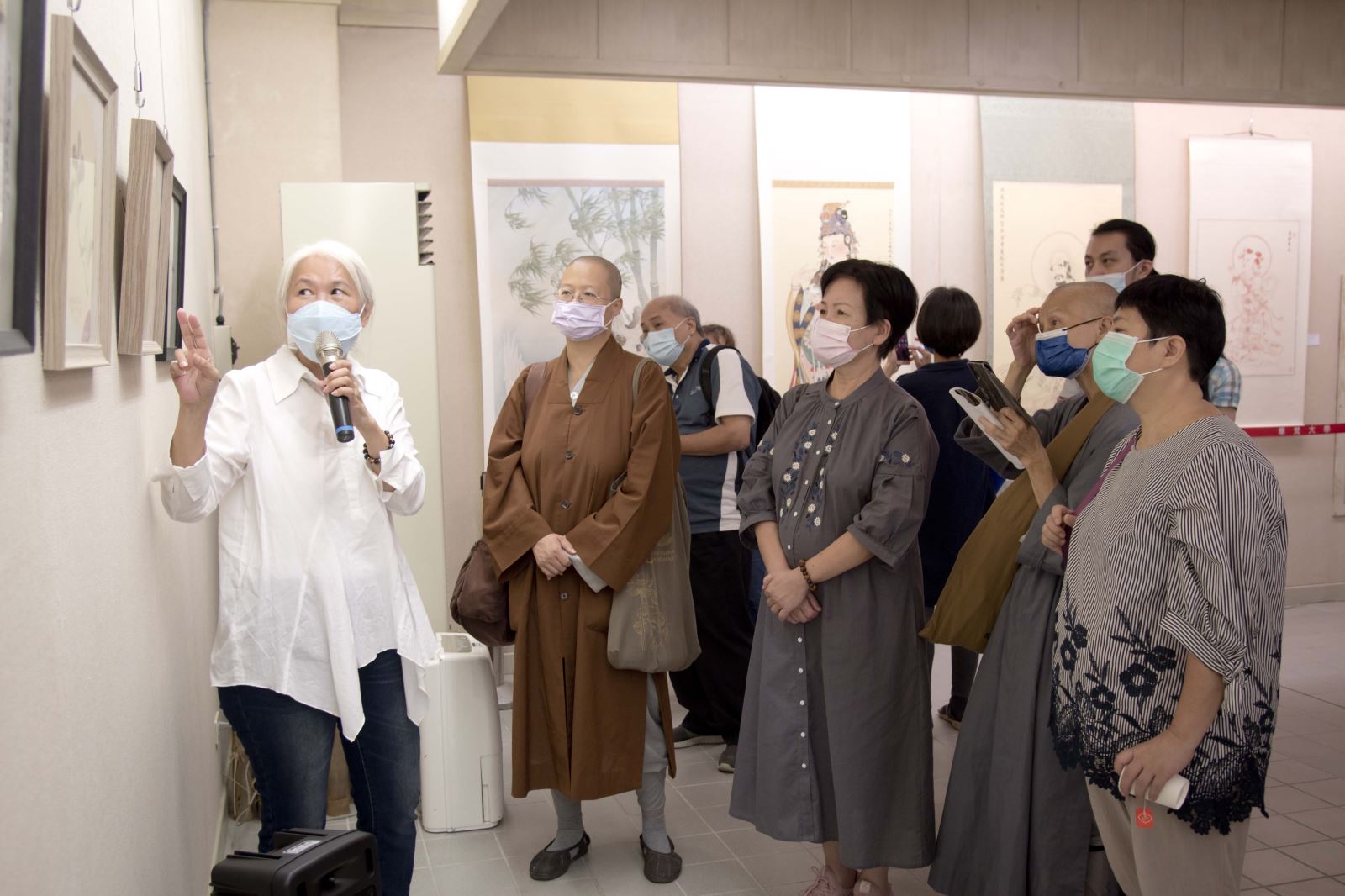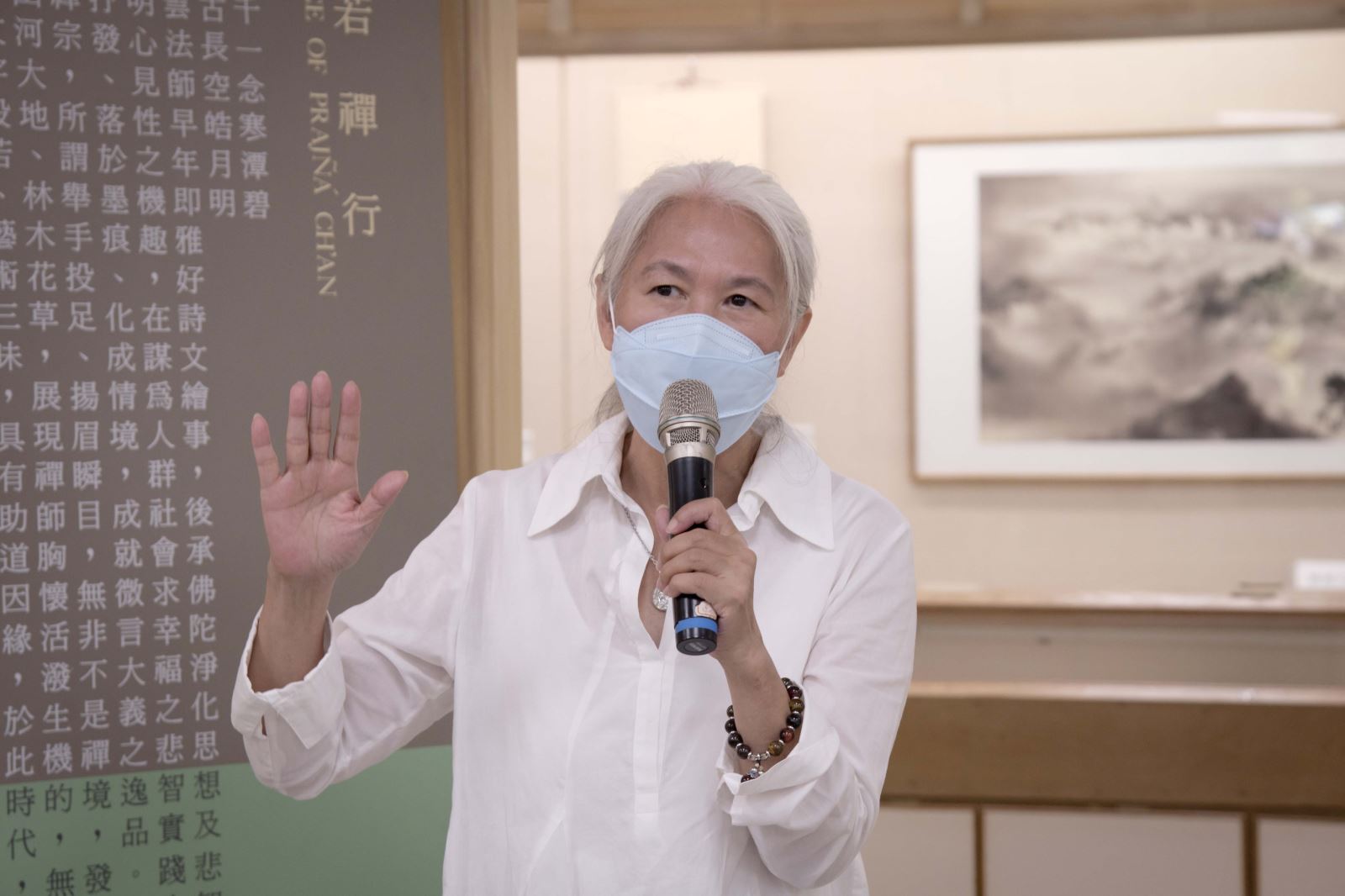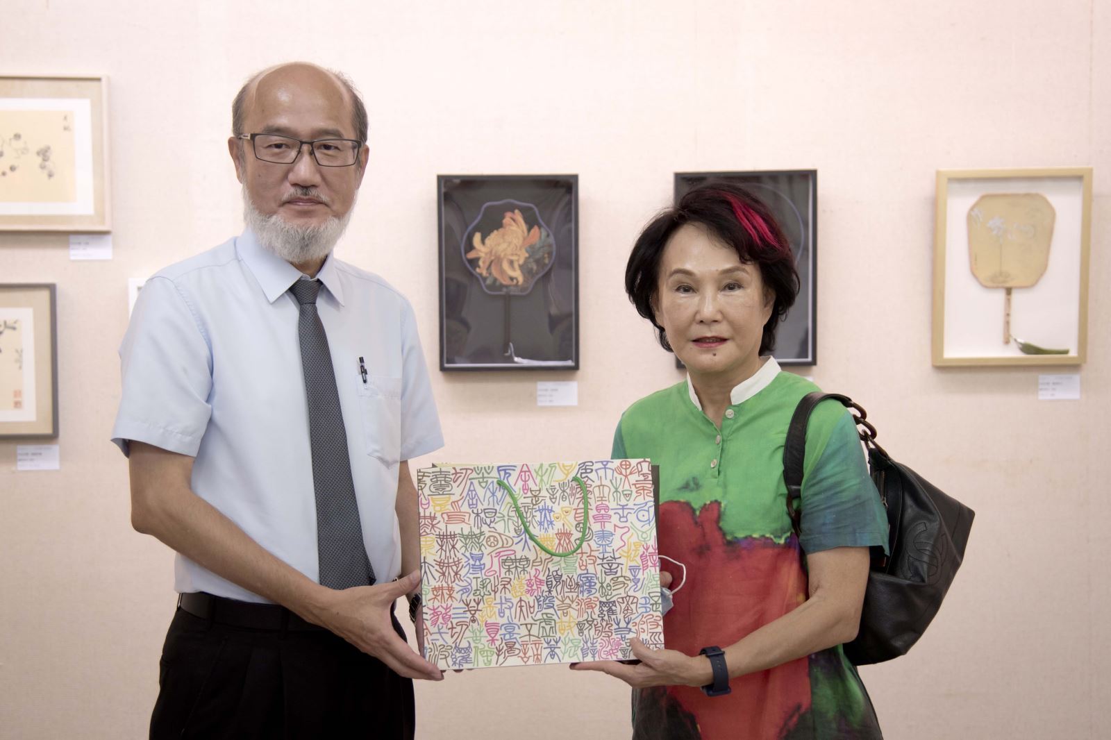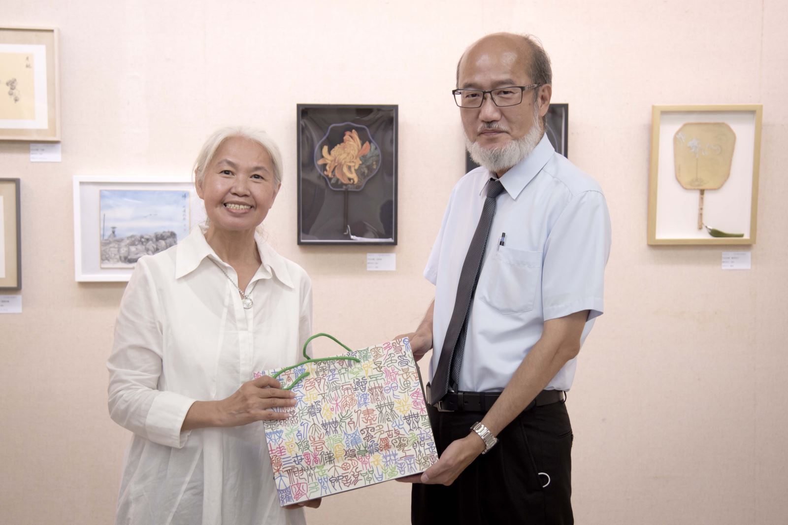 另外,包括華梵大學簡江儒教務長、佛教藝術學系釋智善主任、華梵文物館陳娟珠主任、國立臺灣藝術大學視覺傳達設計學系蘇沛萱教授、中華大風馨傳書畫會金增光理事等人也上台致詞,給予宋妍嫿老師加油打氣,祝賀展覽圓滿成功。