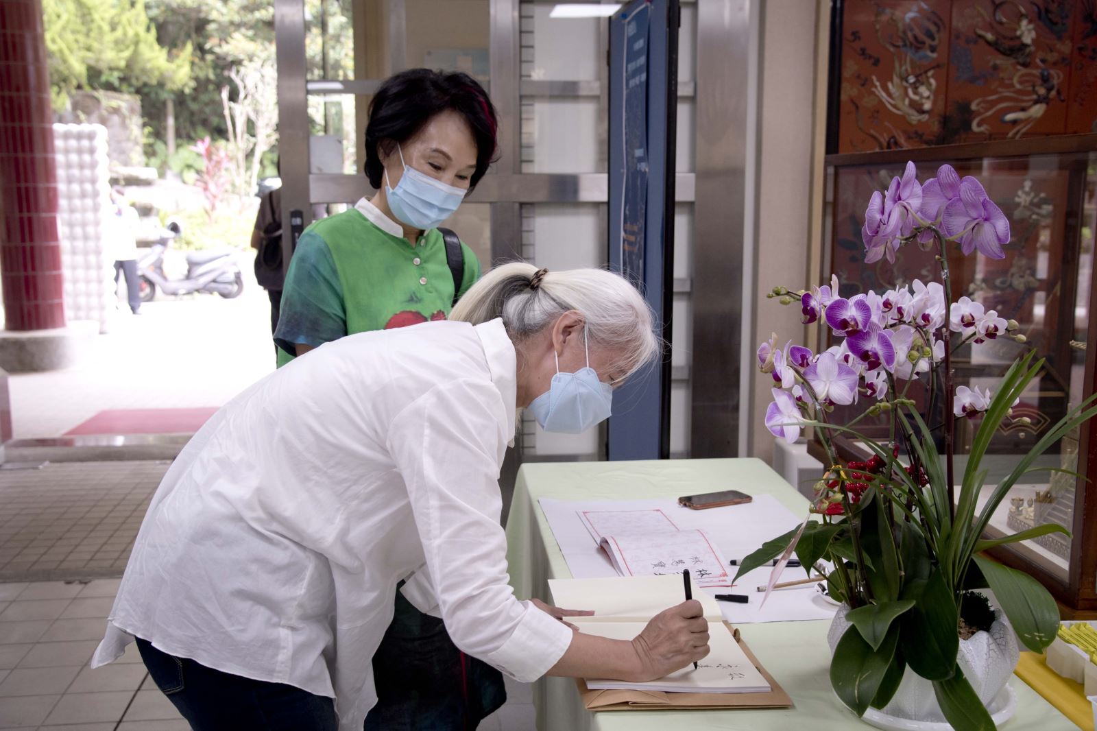 宋姸嫿老師為資深藝人胡錦女士簽書。