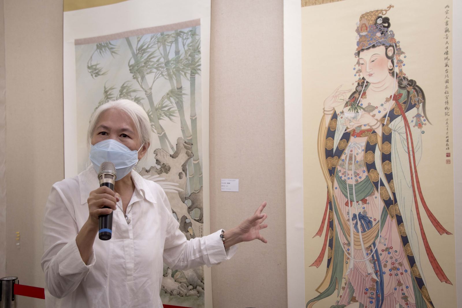 華梵大學林從一校長也說,看到畫作中的龍蝦、珊瑚,以及提著鯉魚的飄飄然女子,就讓他感受到熱愛澎湖家鄉的宋妍嫿老師將文化傳統融入生活,而她的佛畫更不只是象徵性的遙不可及,而是帶著說故事的畫風,就與她本人一頭白髮、一席白衣的裝扮一樣,既入世又脫俗,令人非常感動。