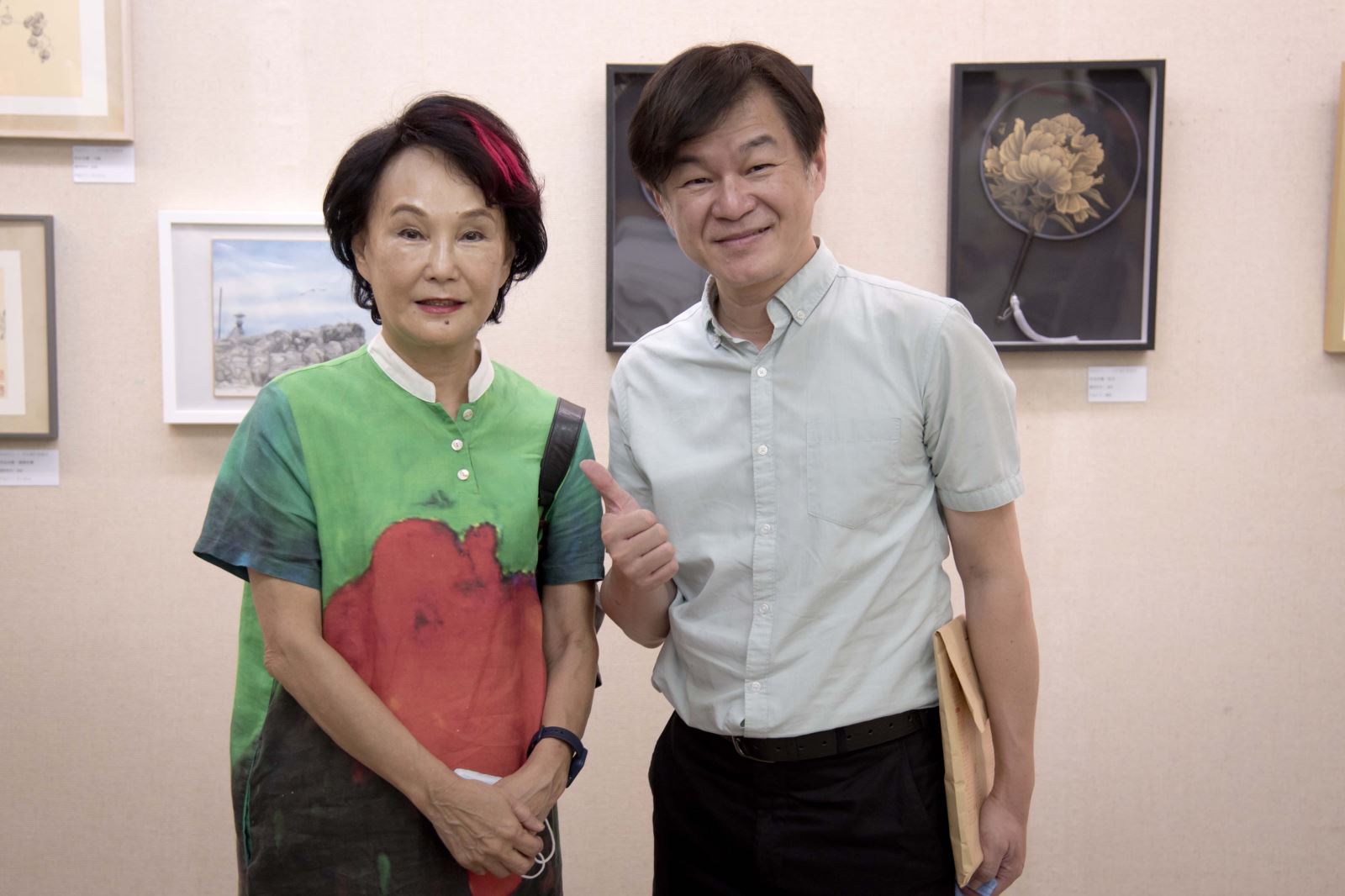 由於宋妍嫿老師求學時也是歐豪年大師的學生,此次與胡錦見面可說相談甚歡,熱愛繪畫的胡錦亦相當讚賞宋妍嫿老師的創作,對於華梵大學文物館的展場更是相當滿意,並透露未來有意在此舉辦個人攝影展,並邀集影藝界人士合辦畫展。