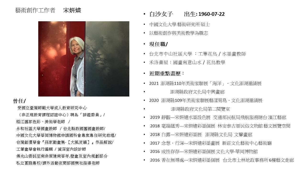 出生澎湖白沙的宋妍嫿號白沙女子,現為臺北市中山社區大學國畫老師,從小學佛的她為張大千大風堂之再傳弟子,傳承先師孫家勤教授及大風堂藝術心法,潛心研究古畫意境,尤其專長工筆、寫意技法,題材兼及佛畫﹑花卉、山水、人物、禽鳥、魚貝、走獸,描繪出彩墨難得一見的文雅內蘊氣質。