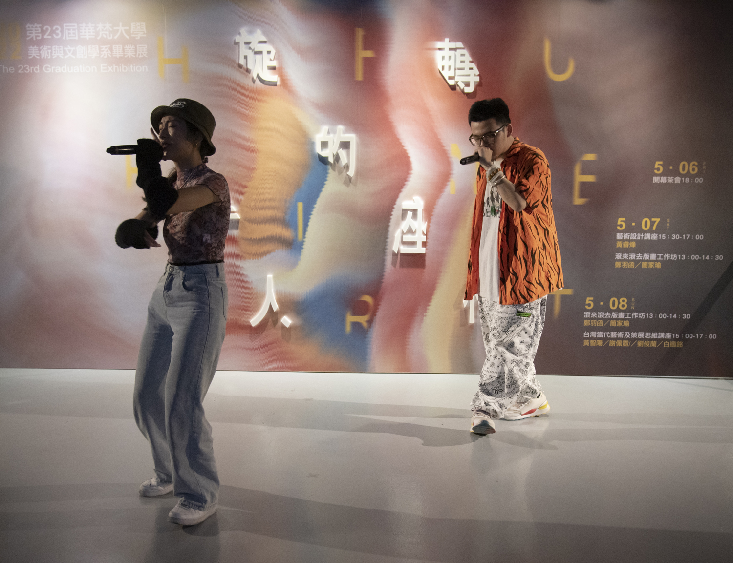 「旋轉的單人座椅」在參展同學精彩的嘻哈表演下揭開序幕,包括國立歷史博物館前館長廖新田教授、國立臺灣師範大學美術系白適銘主任、國立臺北藝術大學博物館研究所廖仁義教授、羲之堂陳筱君總經理、畫廊協會游文玫秘書長等藝壇人士都蒞臨盛會致詞,為這些新銳藝術家畢業生們加油打氣。