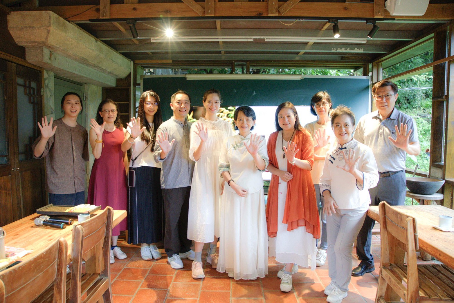 曾在大學教書法的姚采穎說,書法講究師法自然,她的書法課也是從正念冥想開始帶起,今天來華梵參加七碗茶體驗後,深覺日後寫書法時還可搭配喝茶、焚香,透過這些儀式感知自己、感官世界,更加享受茶氣飽滿、氣運全身的身心靈合一境界。 教育電台節目主持人姚臻 ( 右一 ) 、貳零年華旗袍店創辦人林靜端 ( 右二 ) 。 其他來參加七碗靜心茶會的校外貴賓,還有教育電台節目主持人姚臻、貳零年華旗袍店創辦人林靜端等人。茶會結束後,眾人仍依依不捨的留下來與茶師互動,交流心得。林靜端說,「這真的是一場療癒之旅,回程景色如舊,但我的感受全新,非常感恩!」期盼日後還有機會再來華梵體驗。 茶會後與吳慧珍老師 ( 右五 ) 合影。