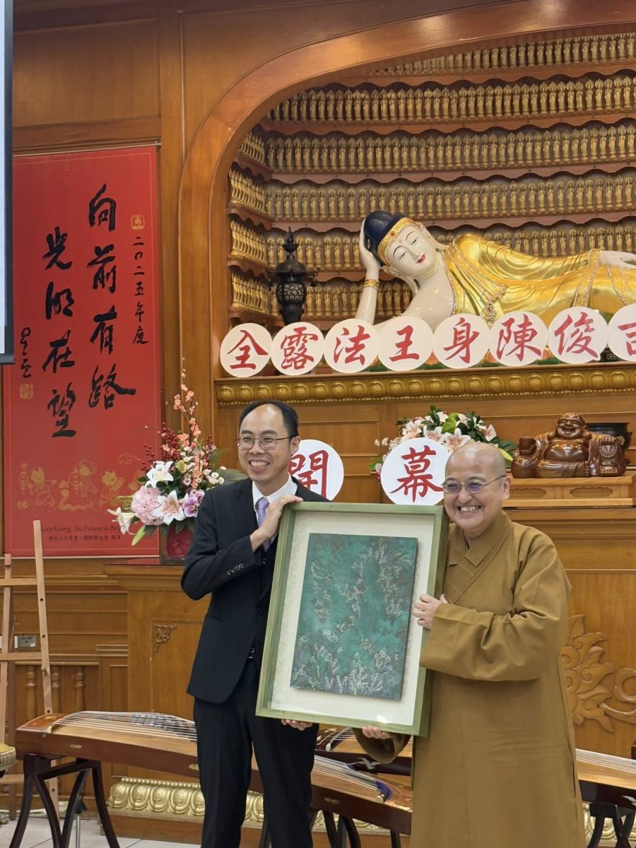陳俊吉主任(左)捐贈作品與法寶寺監寺覺舜法師合影。