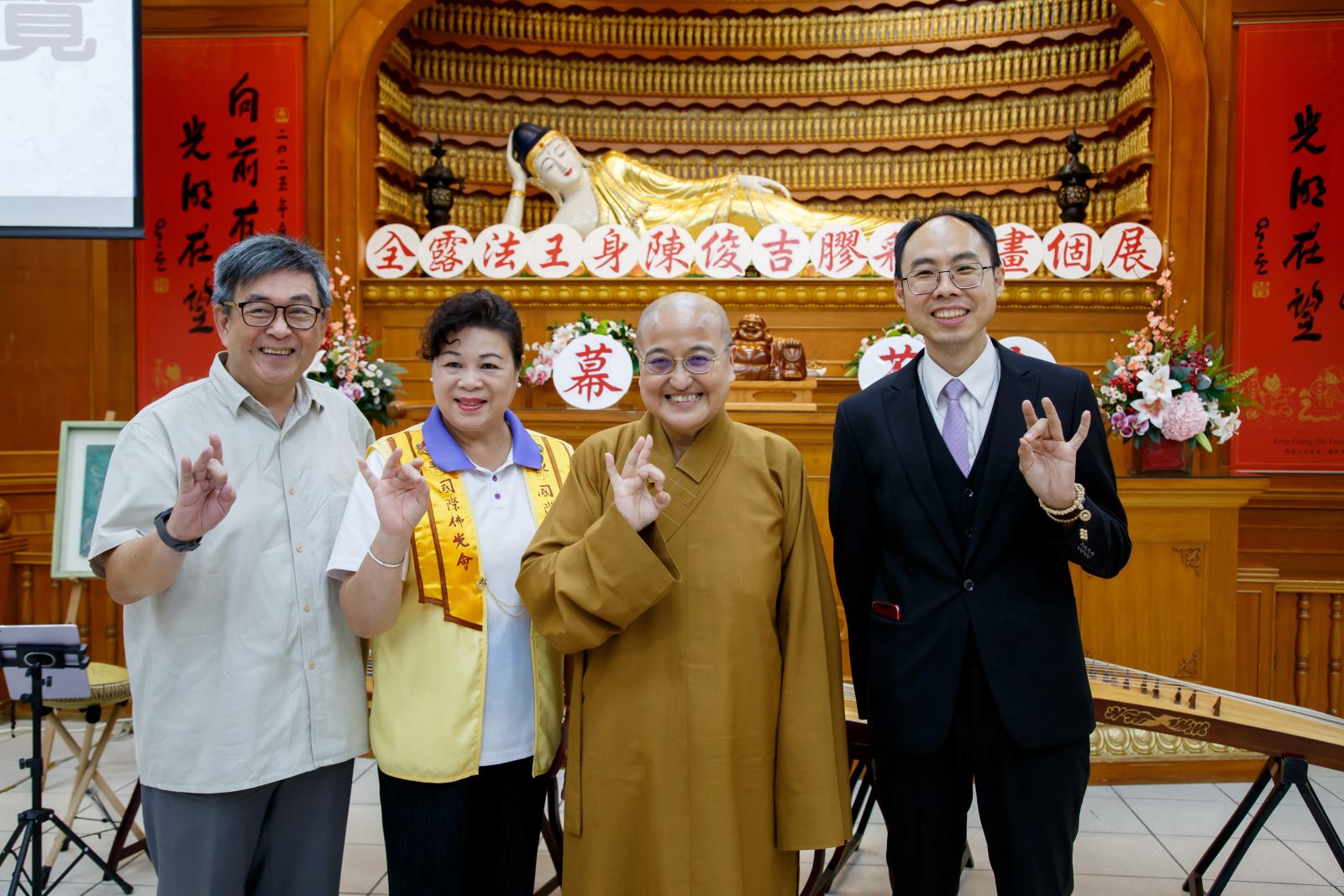 華梵大學李天任校長 ( 左一 ) 、國際佛光會中華總會桃竹苗區委張淑治 ( 左二 ) 、法寶寺監寺覺舜法師 ( 右二 ) 、陳俊吉教授 (右一 ) 開幕合影。