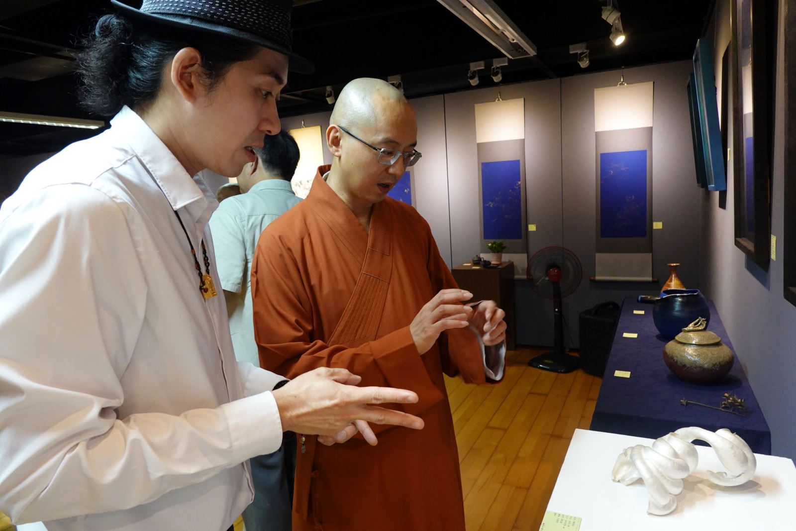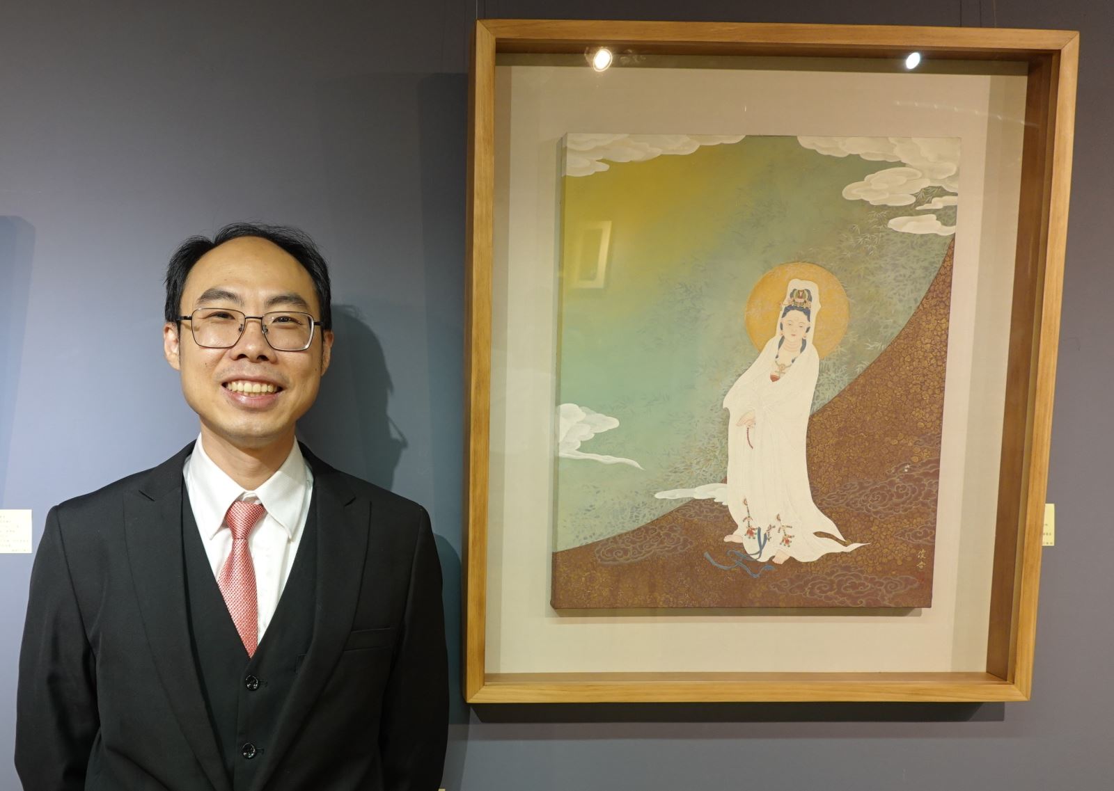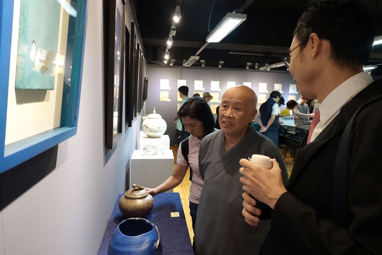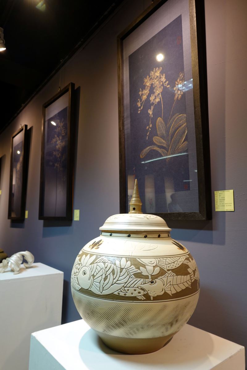 華梵佛藝系教師發起聯展義賣活動,左起:佛藝系廖偉淇老師、善導寺大慧法師、華梵大學李天任校長、佛藝系陳俊吉主任、佛藝系陳高登老師、人文與藝術學院黃智陽院長。 國慶連假做有意義的事,華梵大學佛教藝術學系集結工藝界四大名師,舉辦創系以來首次教師作品義賣聯展,從畫作、陶藝、金工到鋦瓷,以精湛手藝展現時尚、藝術與心靈的雅韻對話,義賣所得將捐助學校整建陶藝教室,讓藝術之美透過教育延伸更遠的力量。 楊英風藝術教育基金會董事長寬謙法師(中)參觀「佛藝雅韻」教師聯展。 「佛藝雅韻」教師聯展於國慶連假期間在華梵大學板橋中心「橋藝術空間」盛大開幕,參展教師陳俊吉、金優石、廖偉淇與陳高登等四人均為佛藝系名師,所開課程經常爆棚;其中,系主任陳俊吉以膠彩佛畫聞名,韓籍金優石專攻手拉坏與陶瓷彩繪,新銳藝術家廖偉淇擅長金工藝術,陳高登則是陶瓷修復鋦瓷藝術專家。 善導寺住持大慧法師(右)仔細欣賞華梵佛藝系廖偉淇老師的展覽作品。 由於這是華梵佛藝系創系以來首次由教師主動發起以義賣形式舉辦聯展,所拿出的130餘件作品個個精雕細琢,從莊嚴華麗的佛畫、時尚精雅的大漆陶罐,到小巧玲瓏的茶具、香座等,風格多元且宗教性、藝術性、生活應用性兼具,開幕期間吸引許多佛教界大老和藝文愛好者前往觀賞。 華梵佛藝系陳俊吉主任與作品〈數珠觀音〉。 善導寺住持大慧法師即致詞表示,藝術不僅可以豐富生活,更能豐富生命,踏進展廳看到這麼多高水準的作品,深深感受到華梵佛藝系的老師都是用生命在創作,希望參觀者滿載而歸。 華梵大學佛藝系金優石老師的陶藝作品〈粉青蓮花魚罐〉。 推廣佛教藝術近40年的楊英風藝術教育基金會董事長寬謙法師也說,華梵佛藝系努力讓佛教藝術更普遍存在於大眾日常生活乃至生命層次,此次義賣的作品不僅豐富心靈,又能提高生活品質與作為日常應用,充分展現佛教藝術的具體成就,非常難能可貴。 參觀者對華梵佛藝系陳高登老師的作品〈青瓷銅青蛙香座〉愛不釋手。 華梵大學李天任校長指出,華梵大學是全國第一所佛教界人士創辦的高等學府,推動佛教藝術責無旁貸,感謝佛藝系老師熱心發起作品聯展義賣活動,所得將捐給學校作為華梵窯對面陶藝教室的整建費用,完成後對於陶藝教學、展演、研究與推廣將有更大的貢獻,歡迎大家共襄盛舉。 華梵佛藝系廖偉淇老師展示銀器作品〈自在心境〉。 華梵大學簡江儒教務長與人文藝術學院黃智陽院長說,此次佛藝系四大名師聯展,為學生做了一個很好的示範,從色彩繽紛的佛國世界,到古今元素混搭、既生活又具時尚感的金繕工藝及銀器茶具,都令人愛不釋手,展現了佛教藝術創作的新高度。 現場合影。 「佛藝雅韻」華梵佛藝系教師聯展與義賣活動將進行至10月14日為止,地點在華梵大學橋藝術空間(新北市板橋區文化路二段242號6樓),歡迎社會大眾免費前往參觀。
